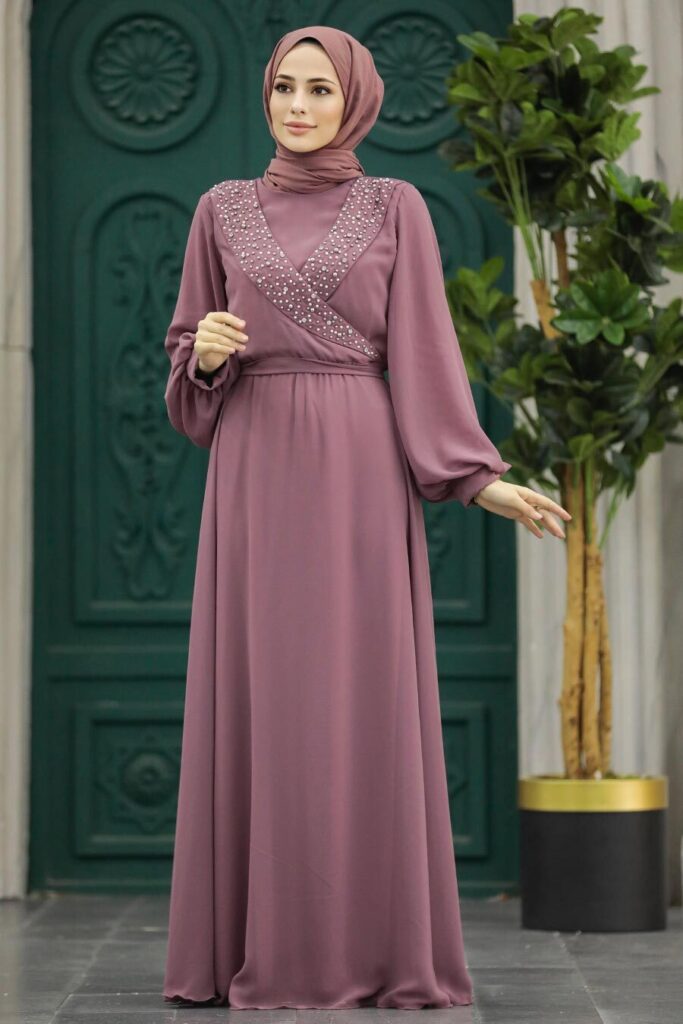 فستان سهرة حجاب – فستان سهرة حجاب بني مع ذيل 4986kh