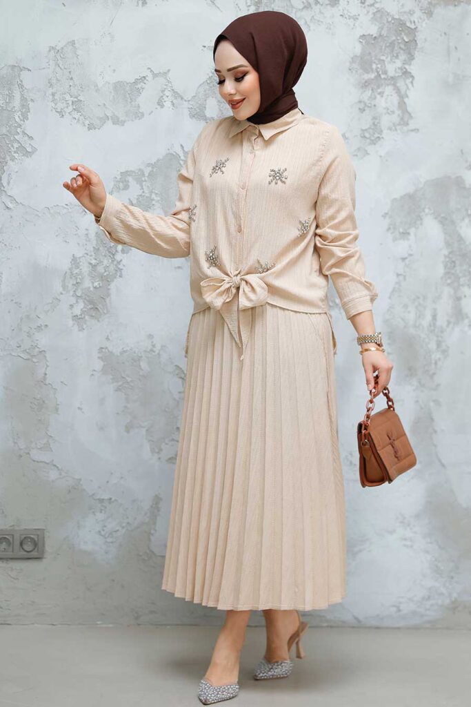 بدلة مزدوجة تنورة حجاب بيج مع تفاصيل خرز 60062 بيج