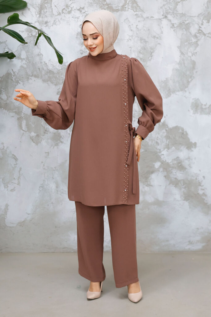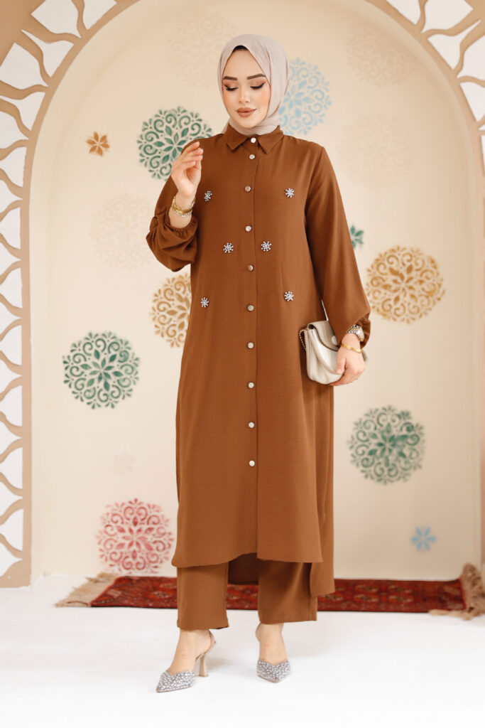 بدلة مزدوجة بحجاب كراميل مفصلة بالخرز 12082krml