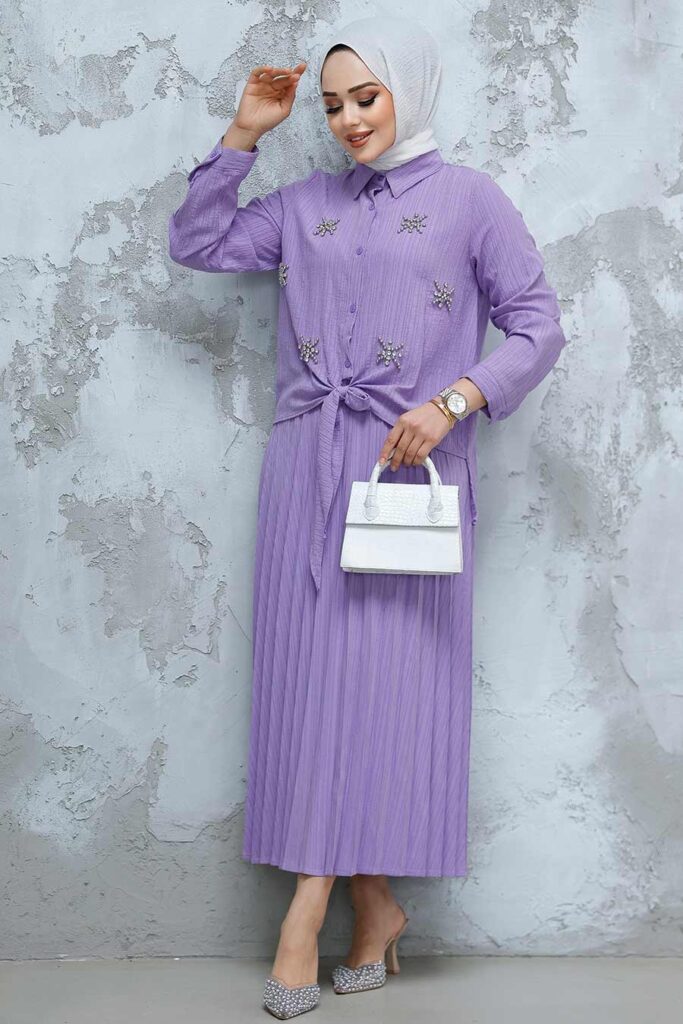 بدلة مزدوجة بتنورة حجاب أرجوانية مفصلة بالخرز 60062lıla