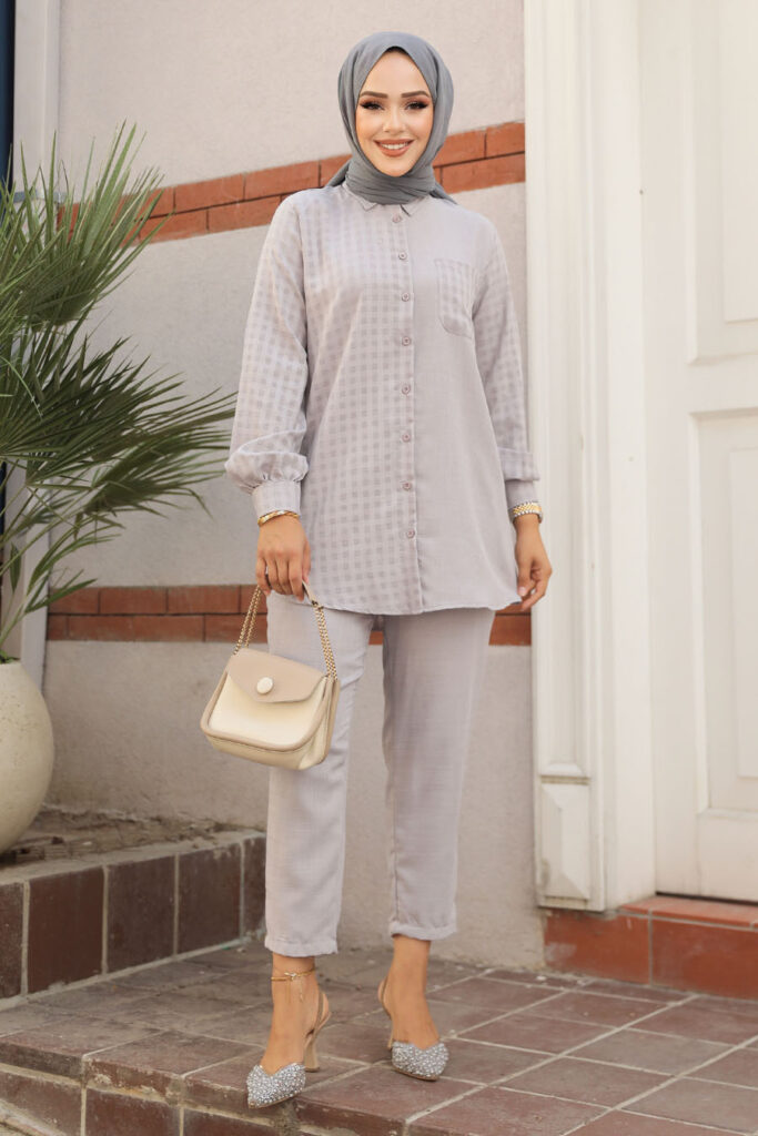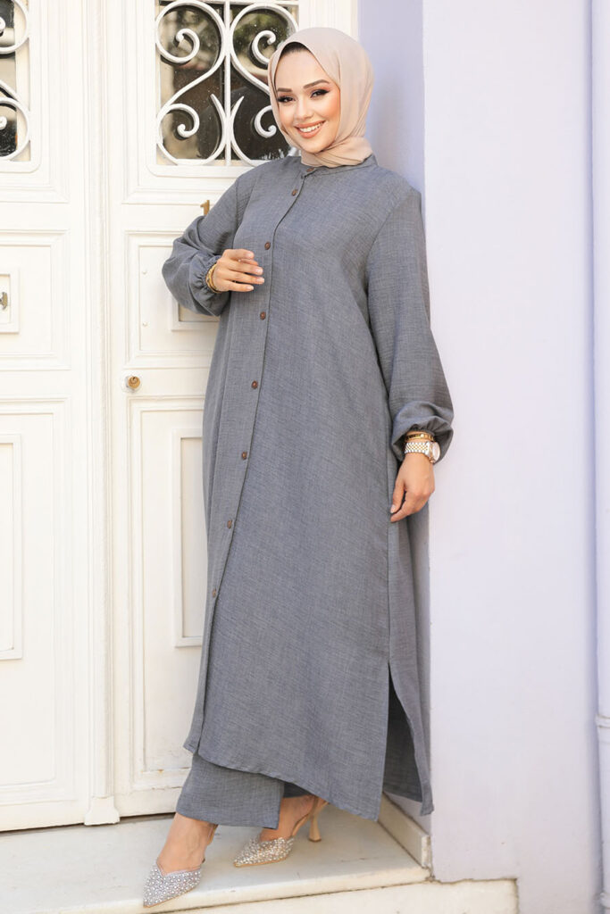 بدلة مزدوجة بحجاب رمادي بتفاصيل من القماش القطني 12191gr