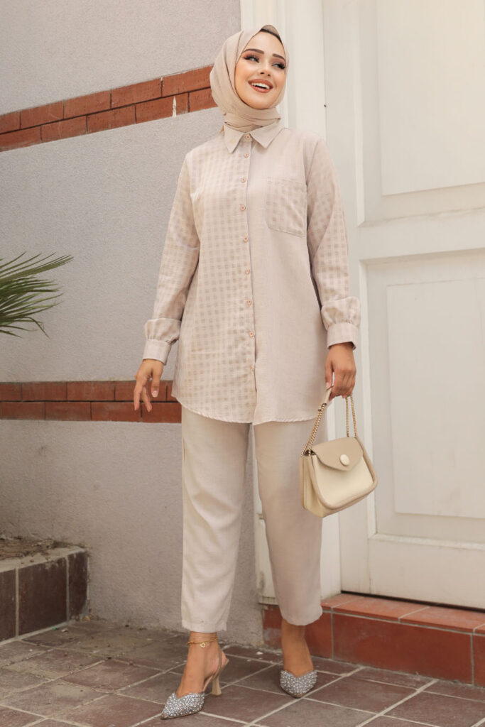 بدلة مزدوجة بحجاب بيج بتفاصيل من القماش القطني 12191 بيج