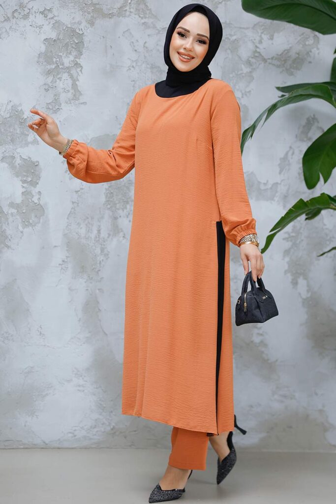 بدلة مزدوجة بحجاب من المنك بتفاصيل من القماش القطني 12191v