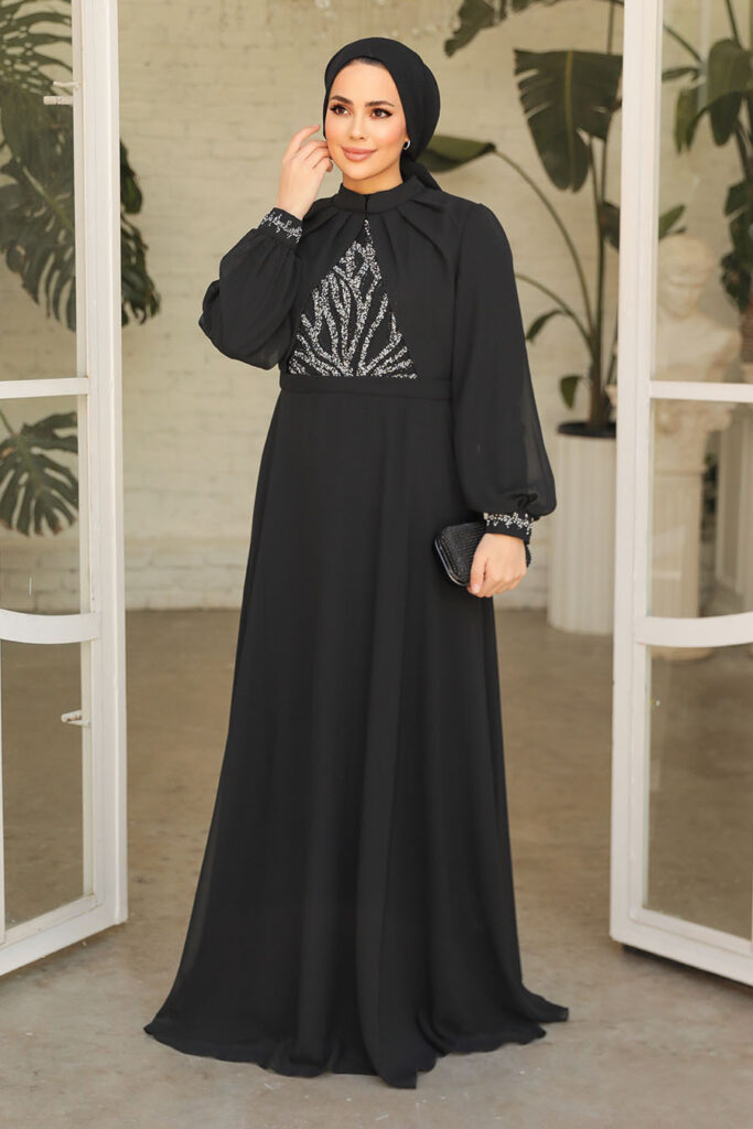 فستان سهرة حجاب – فستان سهرة حجاب أسود مطرز 25886s