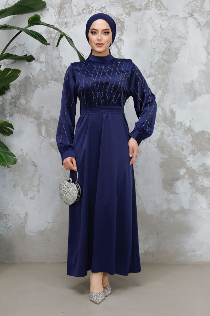 فستان ساتان للحجاب باللون الأزرق الداكن مزين بالخرز 65880l