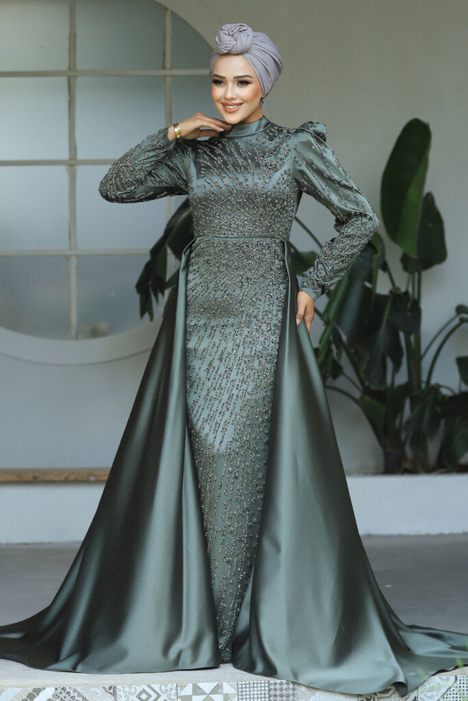 فستان سهرة حجاب – فستان سهرة حجاب كاكي مع ذيل 23310hk