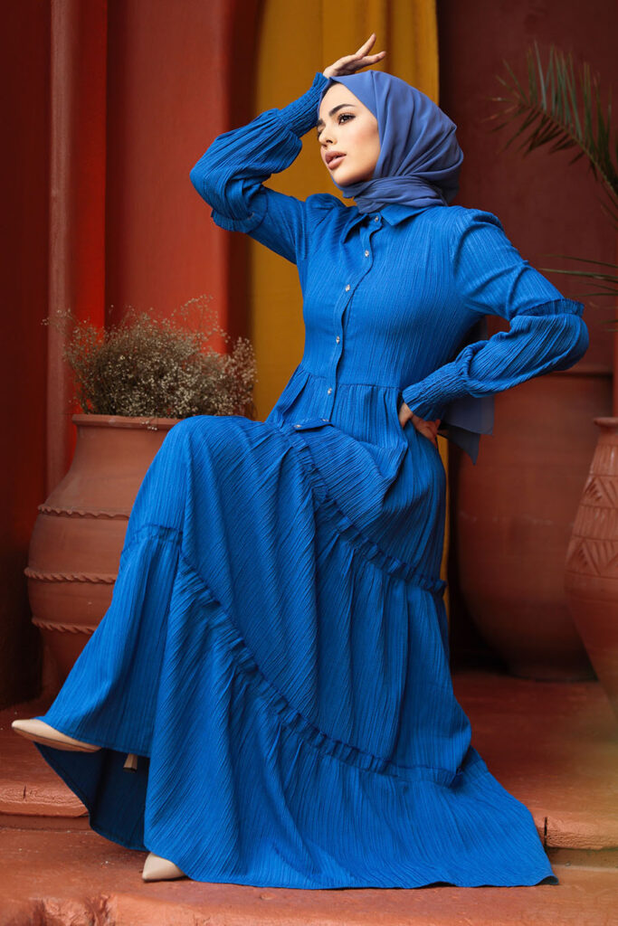 فستان حجاب أزرق نيلي بطيات بطبقات 4421ım