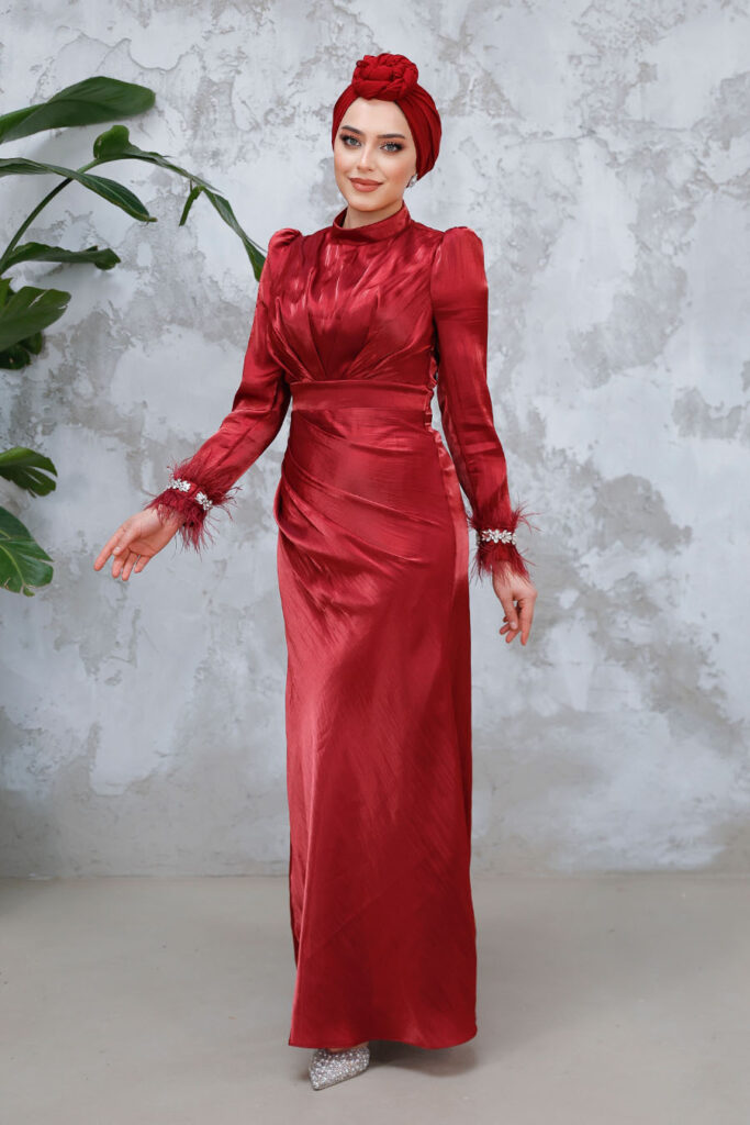 فستان سهرة للحجاب – فستان سهرة للحجاب باللون العنابي مع تفاصيل الريش 50481br