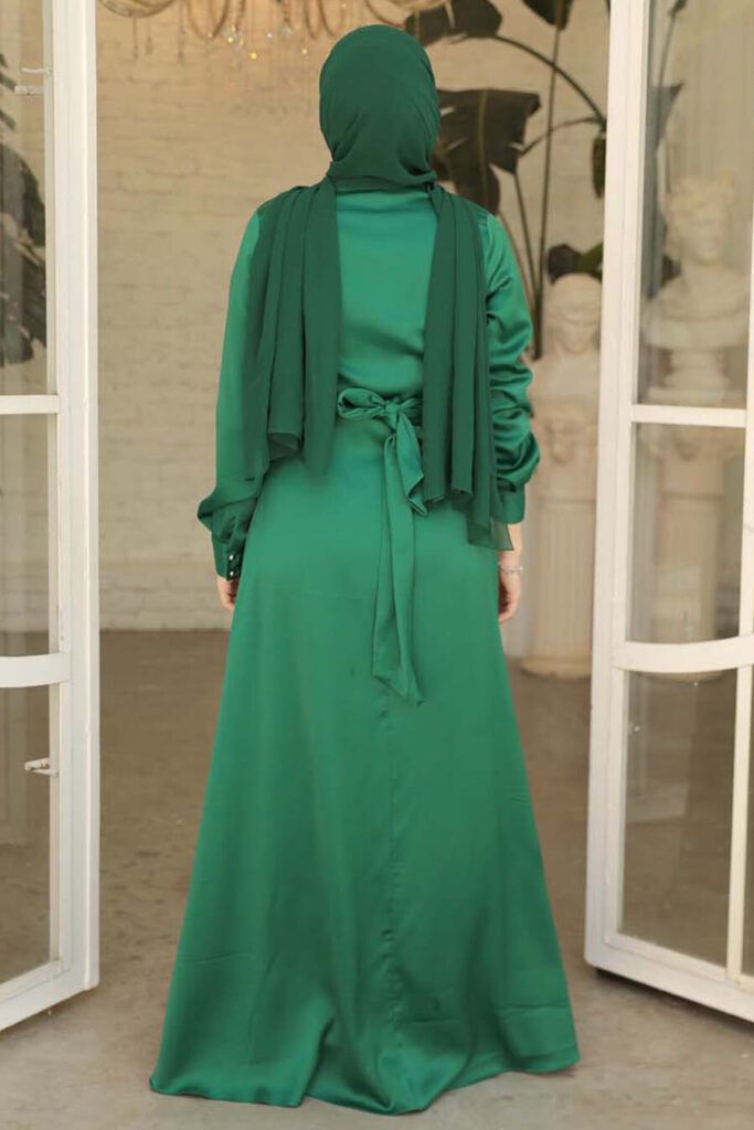 فستان ساتان حجاب أخضر مفصل بأزرار 45661y