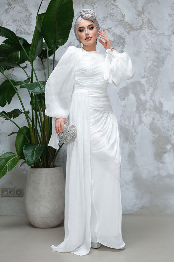 فستان سهرة للحجاب – فستان سهرة للحجاب باللون الأبيض مع تفاصيل الذيل 48491b
