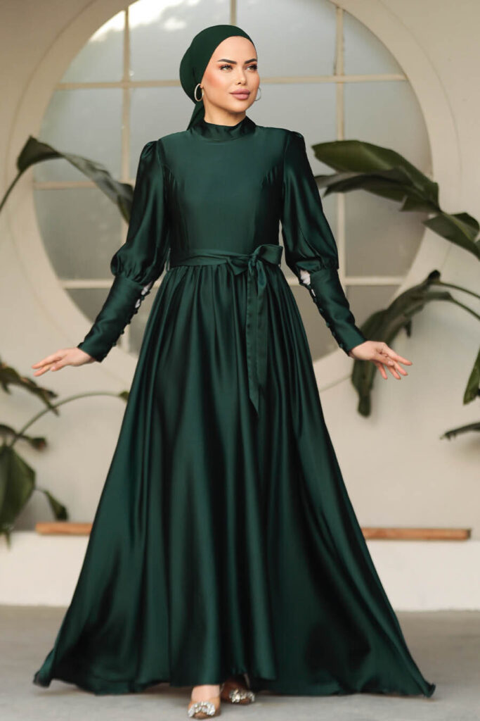 فستان سهرة للحجاب – فستان سهرة من الساتان باللون الأحمر مع تفاصيل ثنى 5921k