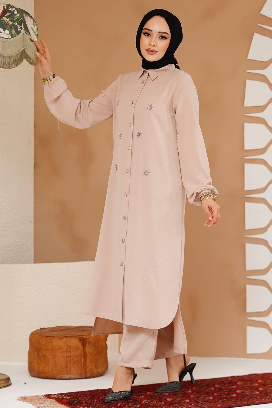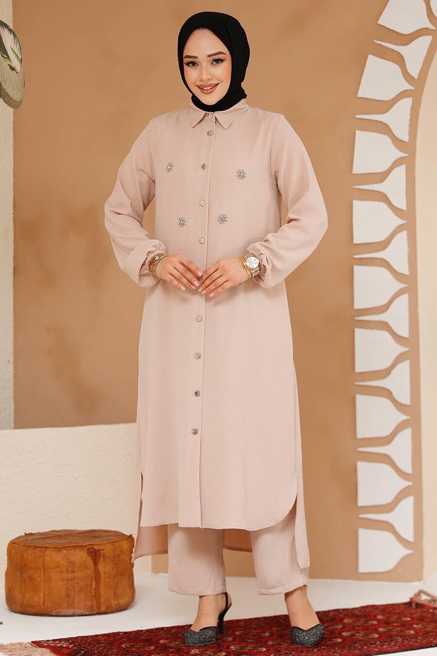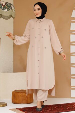 بدلة حجاب بيج مزدوجة مع تفاصيل خرزية 12082 بيج