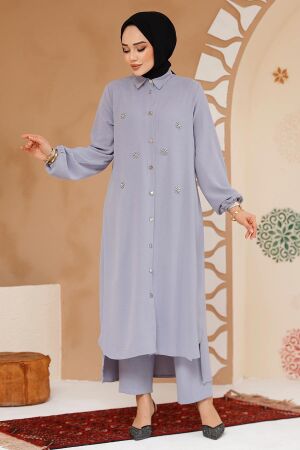 مميزات القماش: مصنوع من 50% بوليستر، 40% قطن، 10% نسيج ليكرا. مميزات المنتج: ياقة كلاسيكية، أكمام طويلة، أطراف أكمام مطاطية، أزرار في المنتصف من الأمام، ظهر طويل، تفاصيل خرز، البنطلون مطاطي عند الخصر وأرجل ضيقة. طول المنتج: الجزء العلوي: 95 سم الجزء السفلي: 125 سم لون المنتج: رمادي – نمط الحياة اختلاف لون المنتج بسبب التصوير. يجوز طلب المحتوى: يُباع هذا المنتج كمجموعة. يتكون الطقم من تونيك وبنطلون مقاس العينة: مقاس 38 الغسيل: يمكن غسله على درجة حرارة 30 درجة دون عصر قياسات الموديل الارتفاع: 165 سم الخصر: 67 سم الأرداف: 98 سم الصدر: 85 سم الوزن: 57.