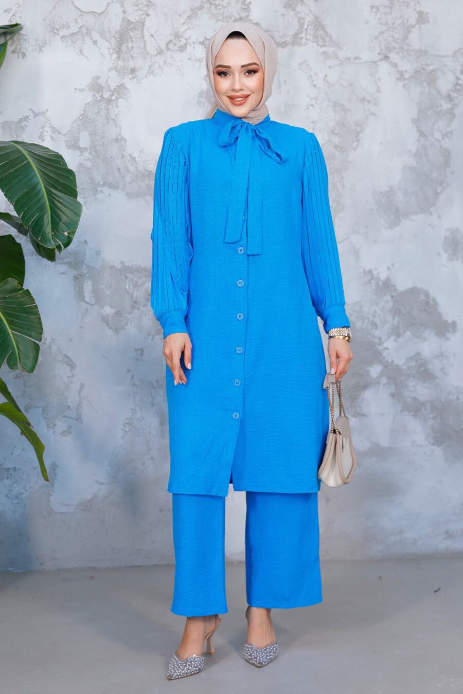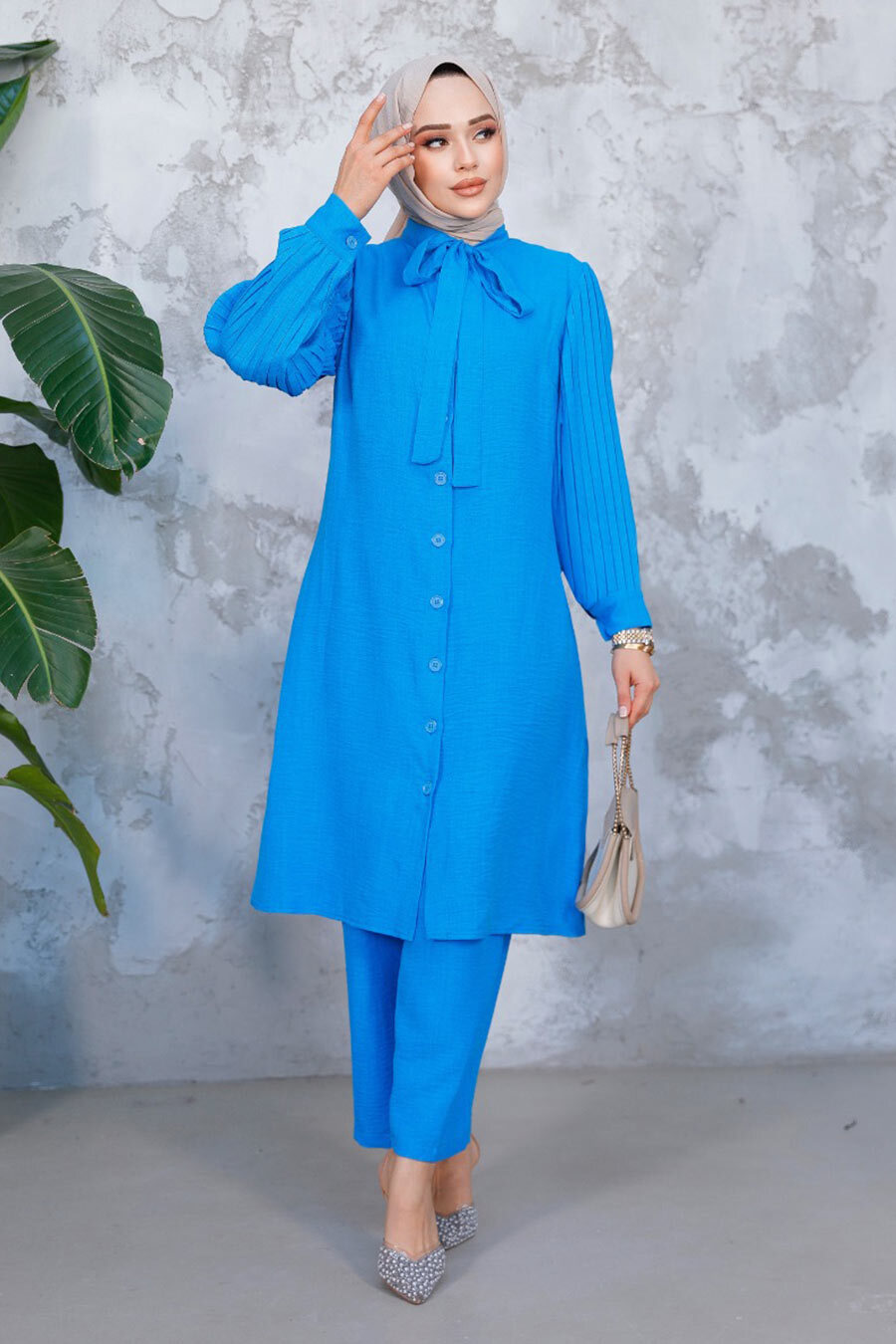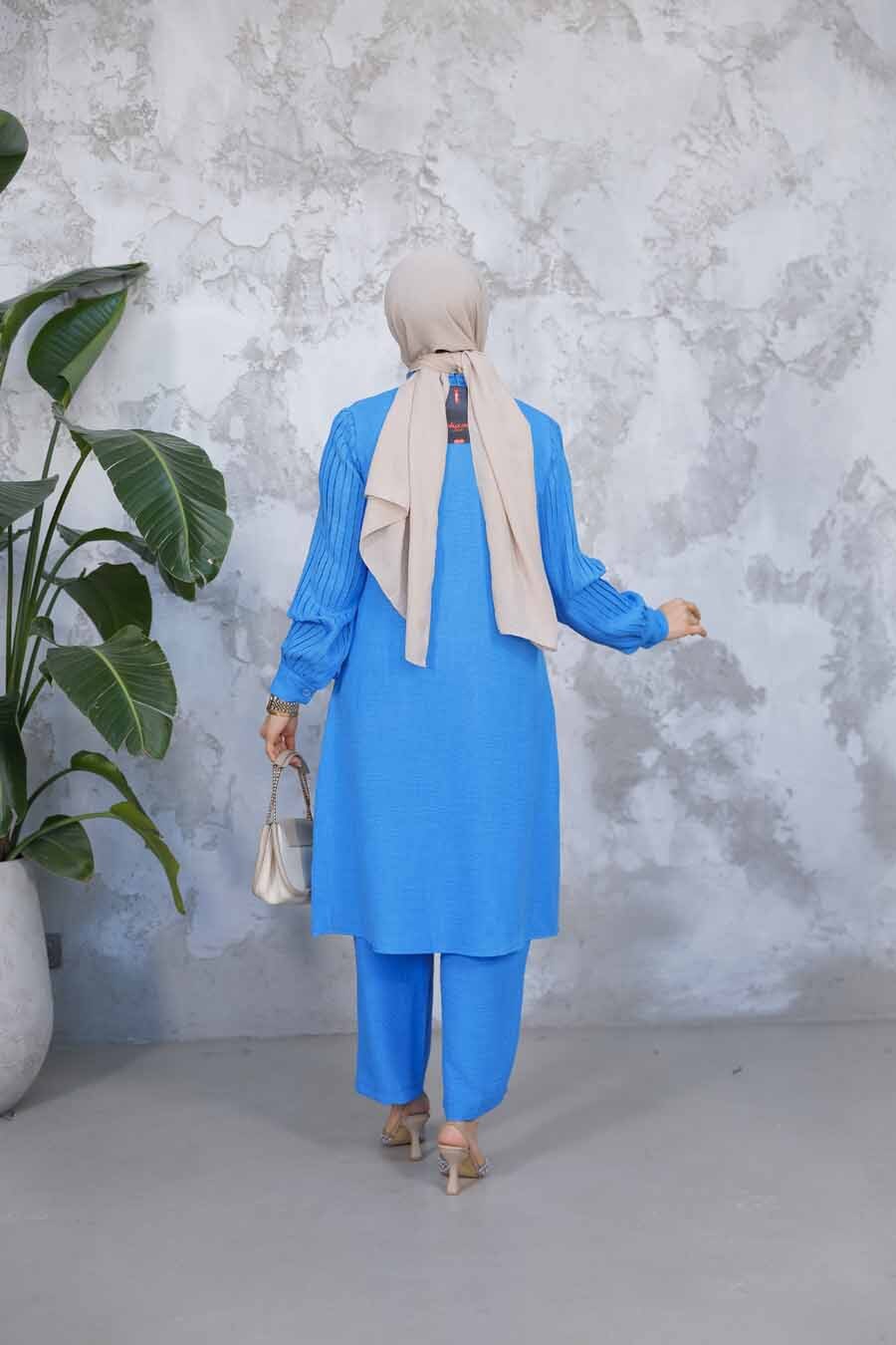 مميزات القماش: مصنوع من نسيج قطن 80% بوليستر خصائص المنتج: رقبة دائرية، وأكمام طويلة، وأكمام مطوية، وياقة مربوطة، وأساور أكمام، وأزرار في منتصف الجزء الأمامي، وبنطلون بخصر مرن وأرجل واسعة.