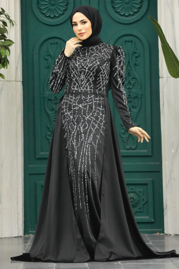 فستان سهرة حجاب – فستان سهرة حجاب أسود مطرز 42081s