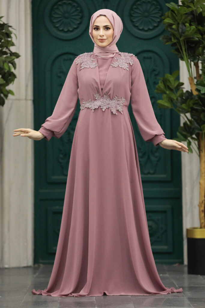 فستان سهرة للحجاب – فستان سهرة للحجاب باللون الوردي المغبر مع تفاصيل الخرز 22113gk