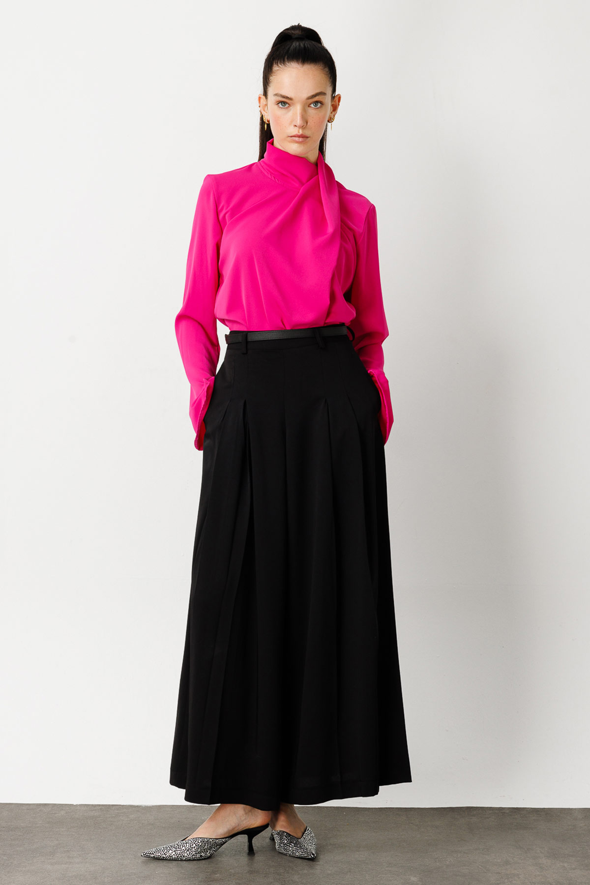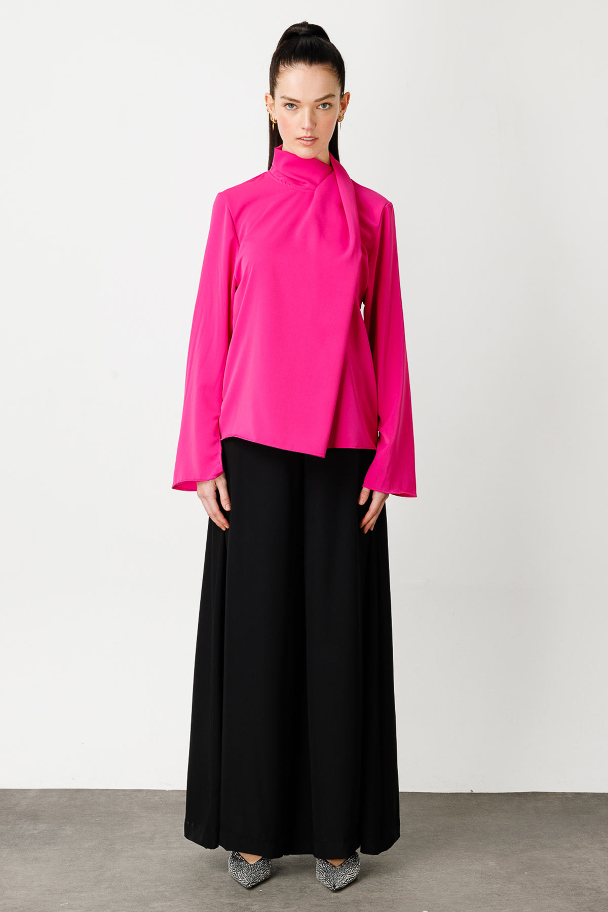 مميزات البلوزة غير المتماثلة: سحاب وأزرار في الخلف، شكل مستقيم، رقبة عالية، بلوزة قماشية انسيابية 100%.