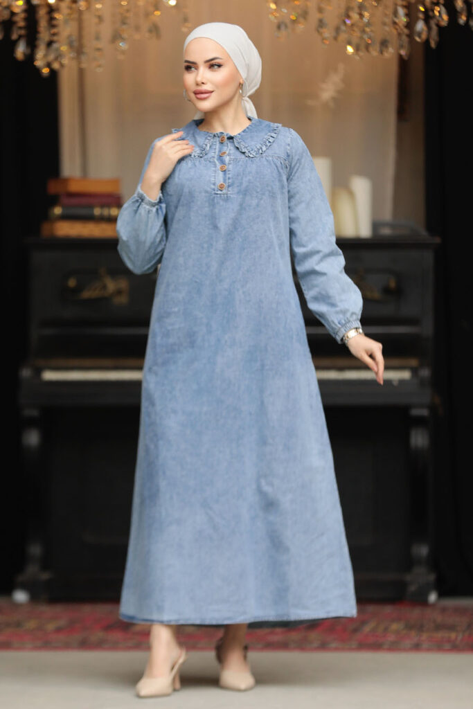 فستان دينم حجاب أزرق بتفاصيل جيب 19101m
