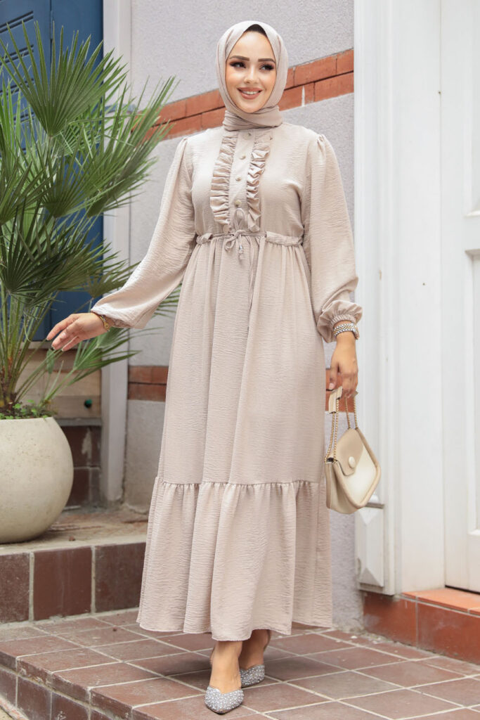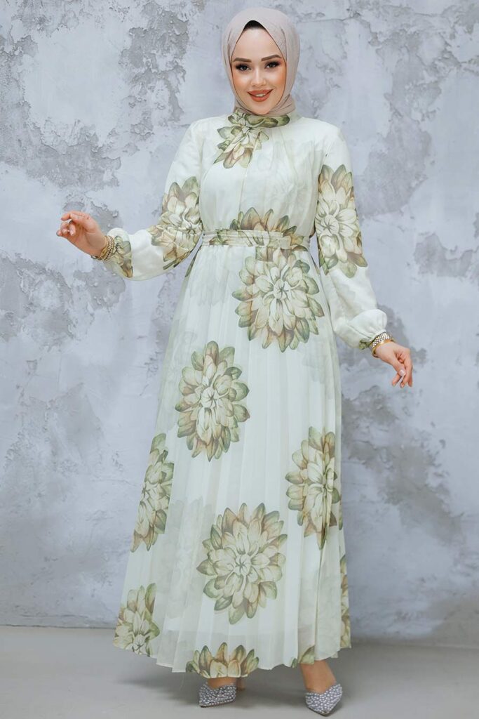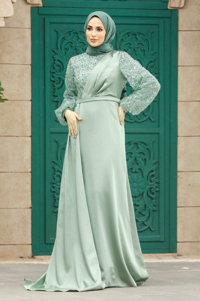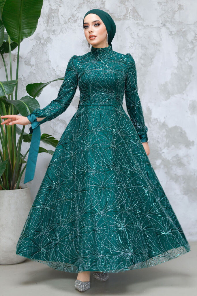 فستان سهرة حجاب – فستان سهرة حجاب أخضر زمردي مطرز بالترتر 4908zy