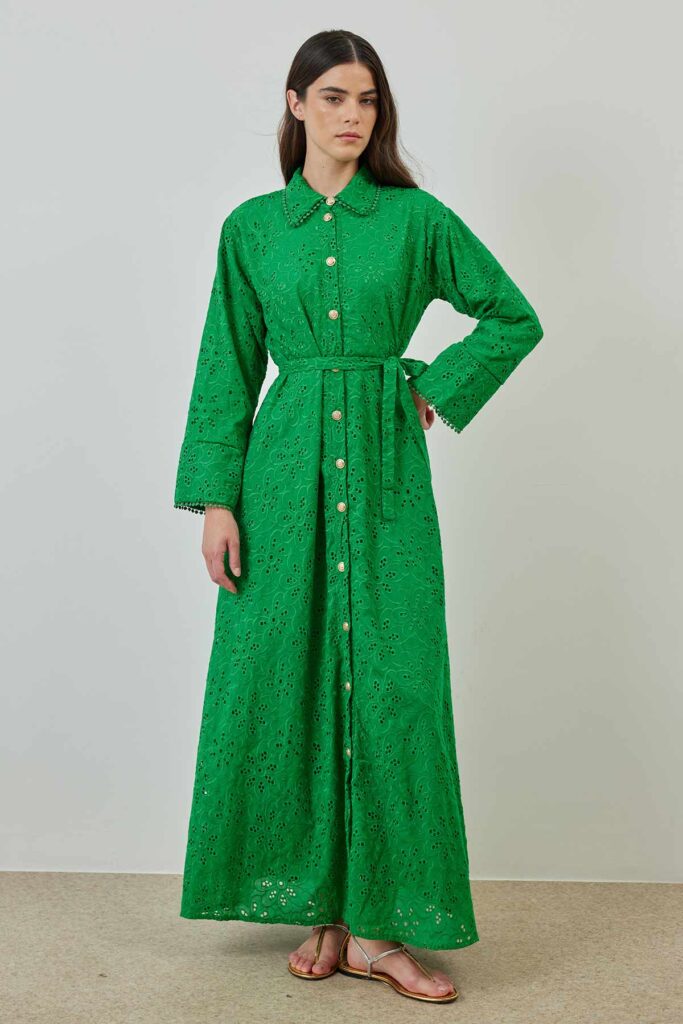 فستان Brode باللون الأخضر مع أزرار ذهبية