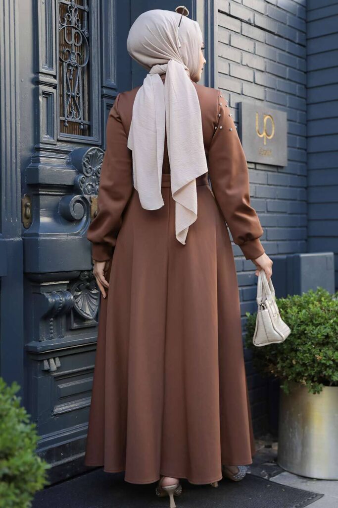 فستان حجاب بني بأكمام مطرزة 23631kh