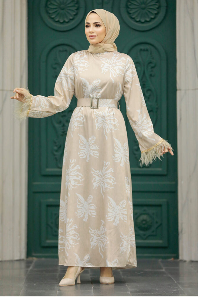 نيفا ستايل – فستان حجاب بيج منقوش 77301 بيج