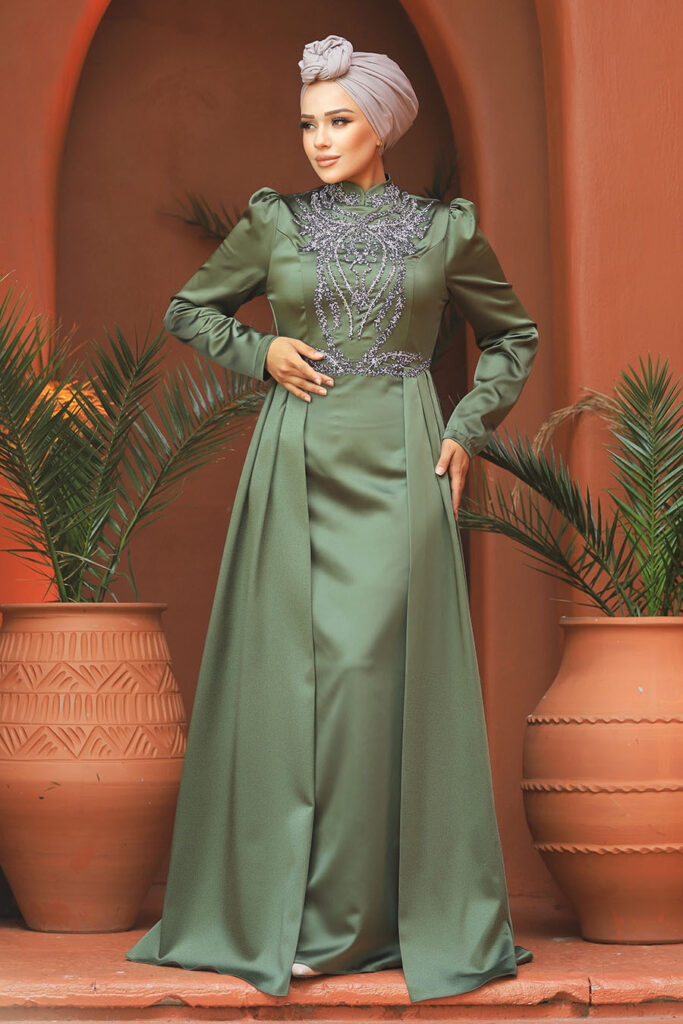 فستان سهرة للحجاب – فستان سهرة من الساتان باللون الكاكي مع ذيل 25878hk
