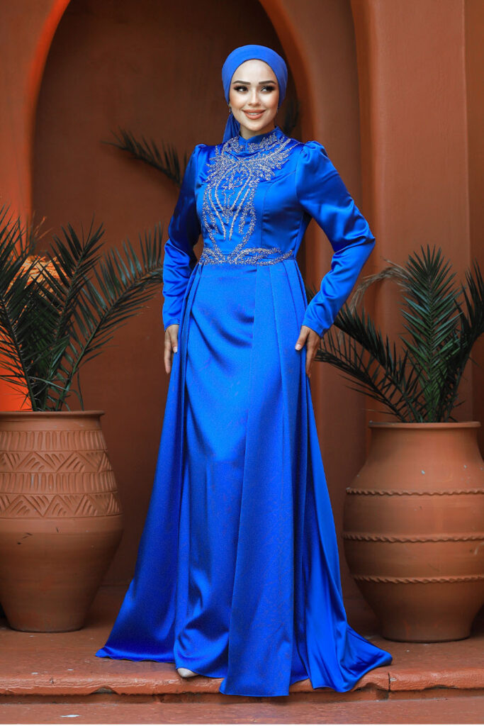 فستان سهرة حجاب – فستان سهرة حجاب ستان أزرق مع ذيل 25878m