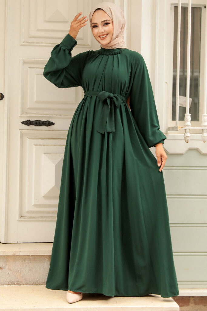 فستان حجاب أخضر زمردي بحزام 330113zy