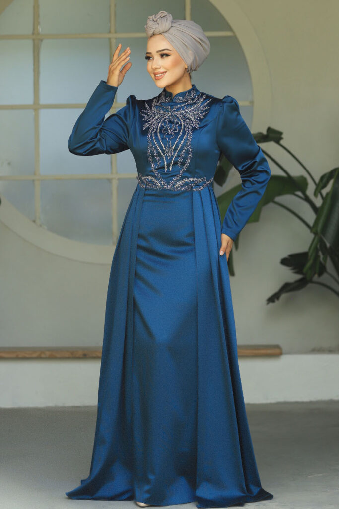 فستان سهرة للحجاب – فستان سهرة من الساتان باللون الأخضر البترولي مع ذيل 25878py