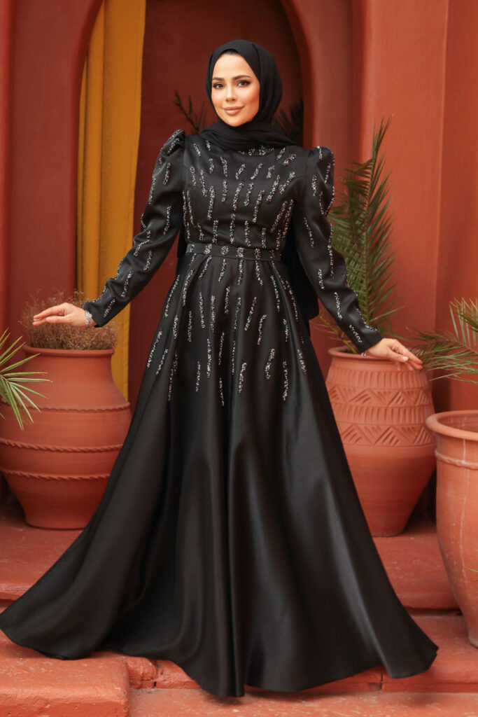 فستان سهرة حجاب – فستان سهرة حجاب أسود مطرز 51891s