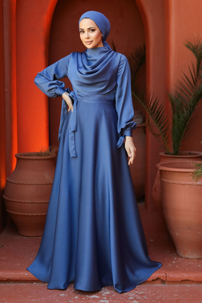 فستان سهرة حجاب – فستان سهرة حجاب ستان أزرق 38031m