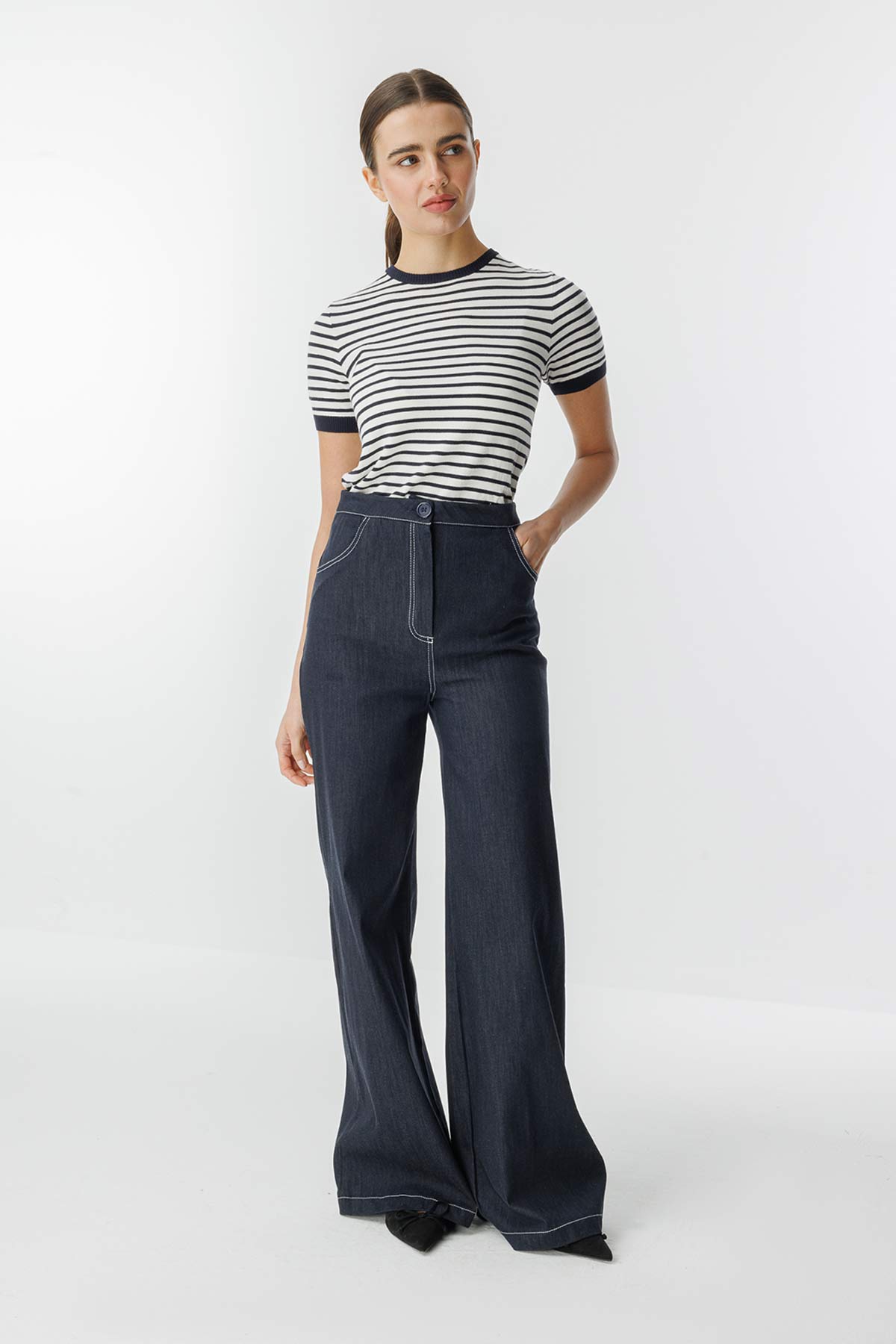 تفاصيل بإبرة مزدوجة وساق واسعة من الدنيم باللون الأزرق الداكن. المميزات تفاصيل خياطة بإبرة مزدوجة، خصر مرتفع، جيوب خلفية وأمامية، بنطلون جينز واسع الساق. محتوى القماش وتعليمات الغسيل: يُغسل عند درجة حرارة 30 درجة مع برامج دقيقة وصناعية وحساسة. 98% قطن، 2% ليكرا، يغسل بالماء البارد، لا تستخدم المجفف. مقاس المنتج الموديل: S قياسات الموديل: الارتفاع: 1.72 سم، الصدر: 80 سم، الخصر: 60 سم، الأرداف: 90 سم