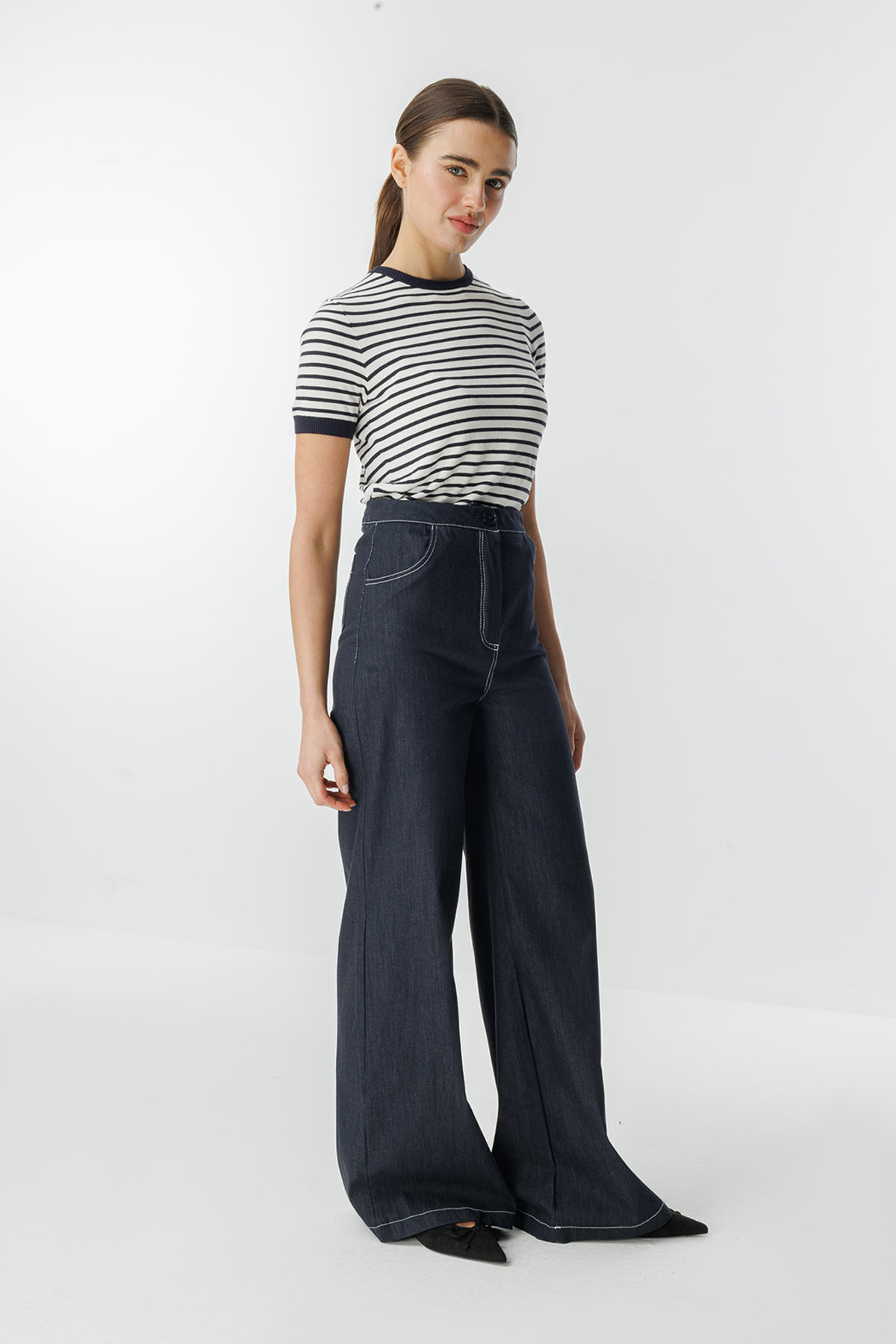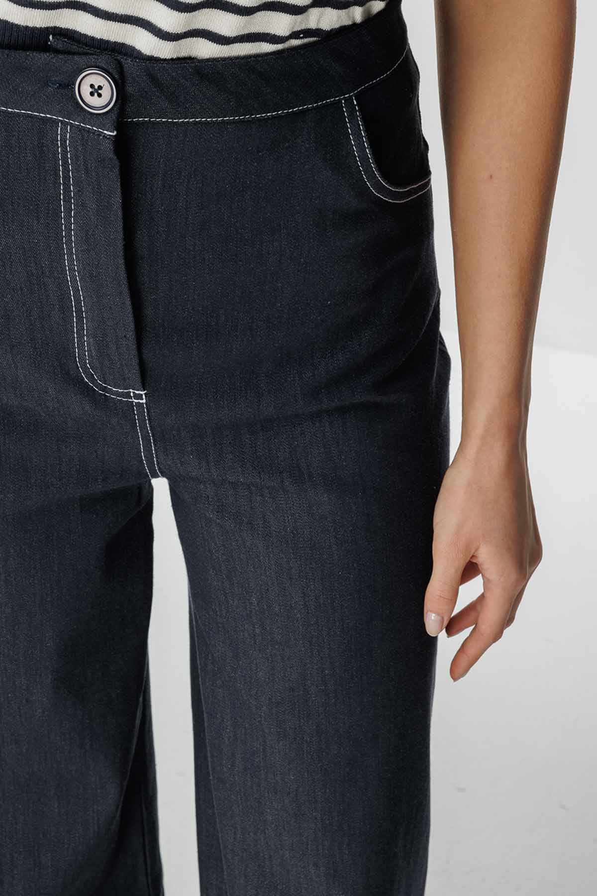 بنطلون جينز واسع الساق بتفاصيل إبرة مزدوجة باللون الأزرق الداكن