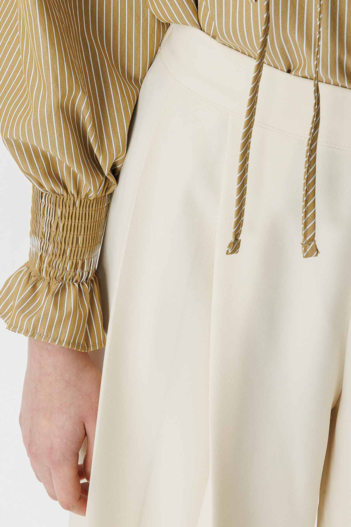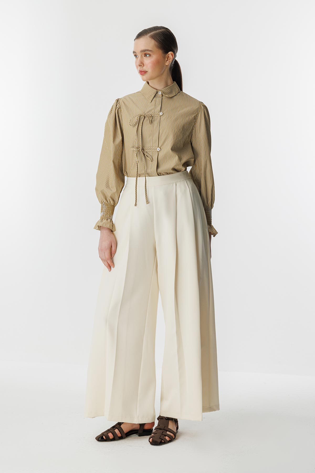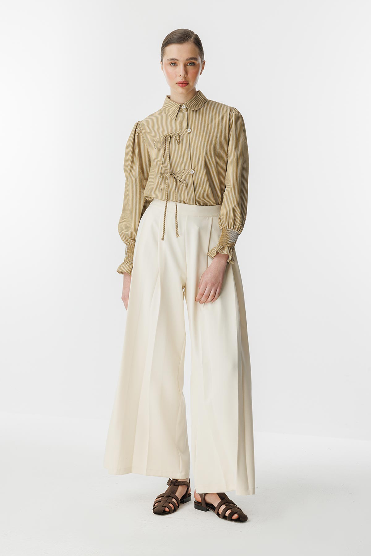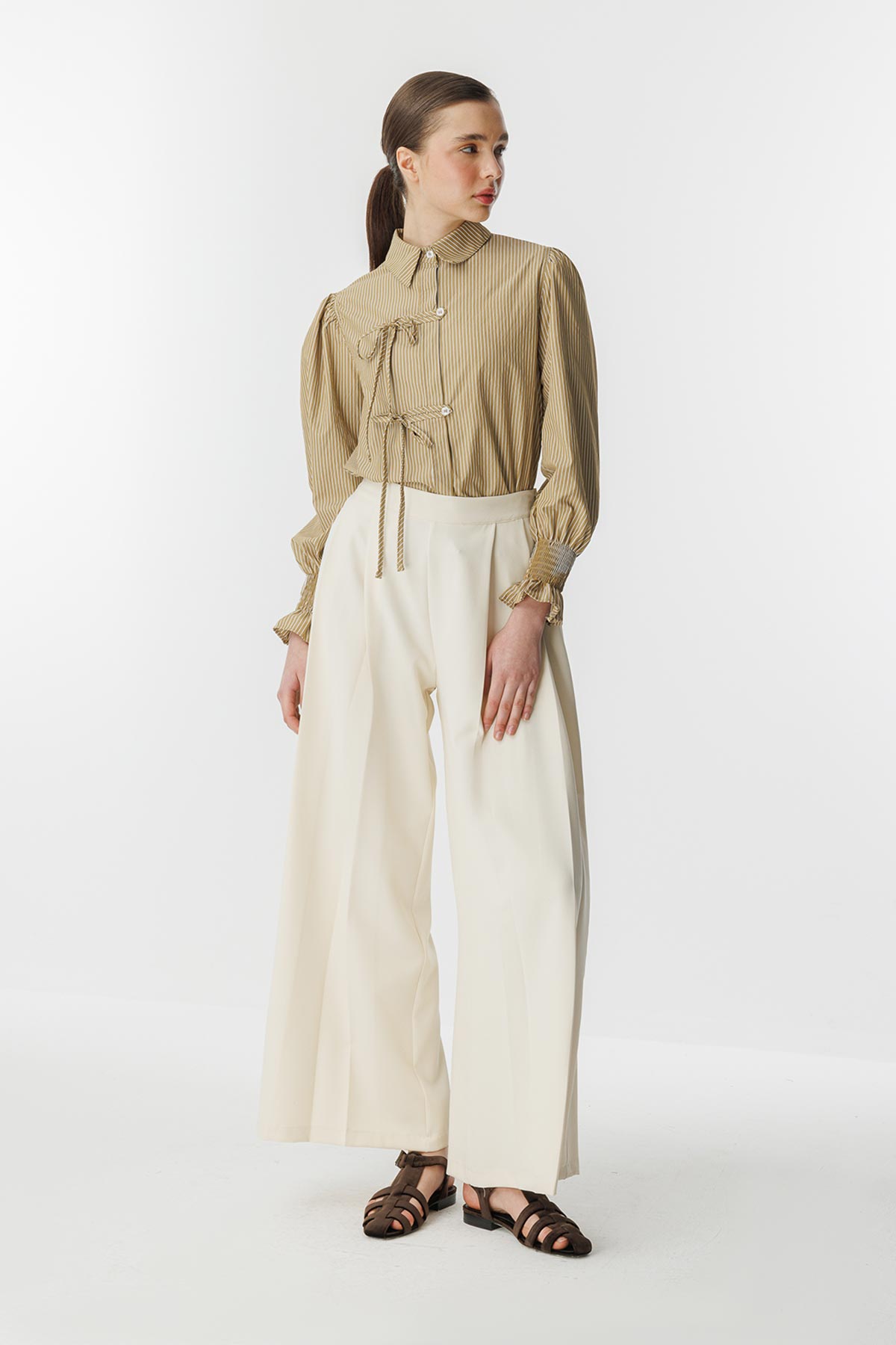 يتميز البنطلون الكريمي ذو الطيات المزدوجة من الأمام بخصر عالٍ، وحزام أمامي، وسحاب جانبي مخفي، ومطاط من الخلف، وطيتين سميكتين، وساق واسعة، وبنطال بالازو من القماش المنسوج المريح لراحة يومية. محتوى القماش وتعليمات الغسيل: غسيل آلي بنسبة 100% عند درجة حرارة 30 درجة في دورة قصيرة، غسيل رقيق. مقاس المنتج: XS قياسات الموديل: الارتفاع: 1.74 سم، الصدر: 78 سم، الخصر: 58 سم، الأرداف: 87 سم