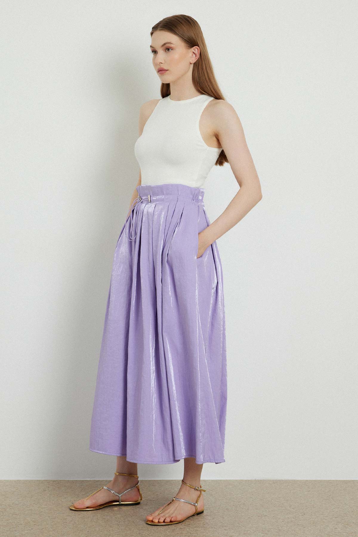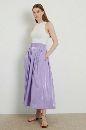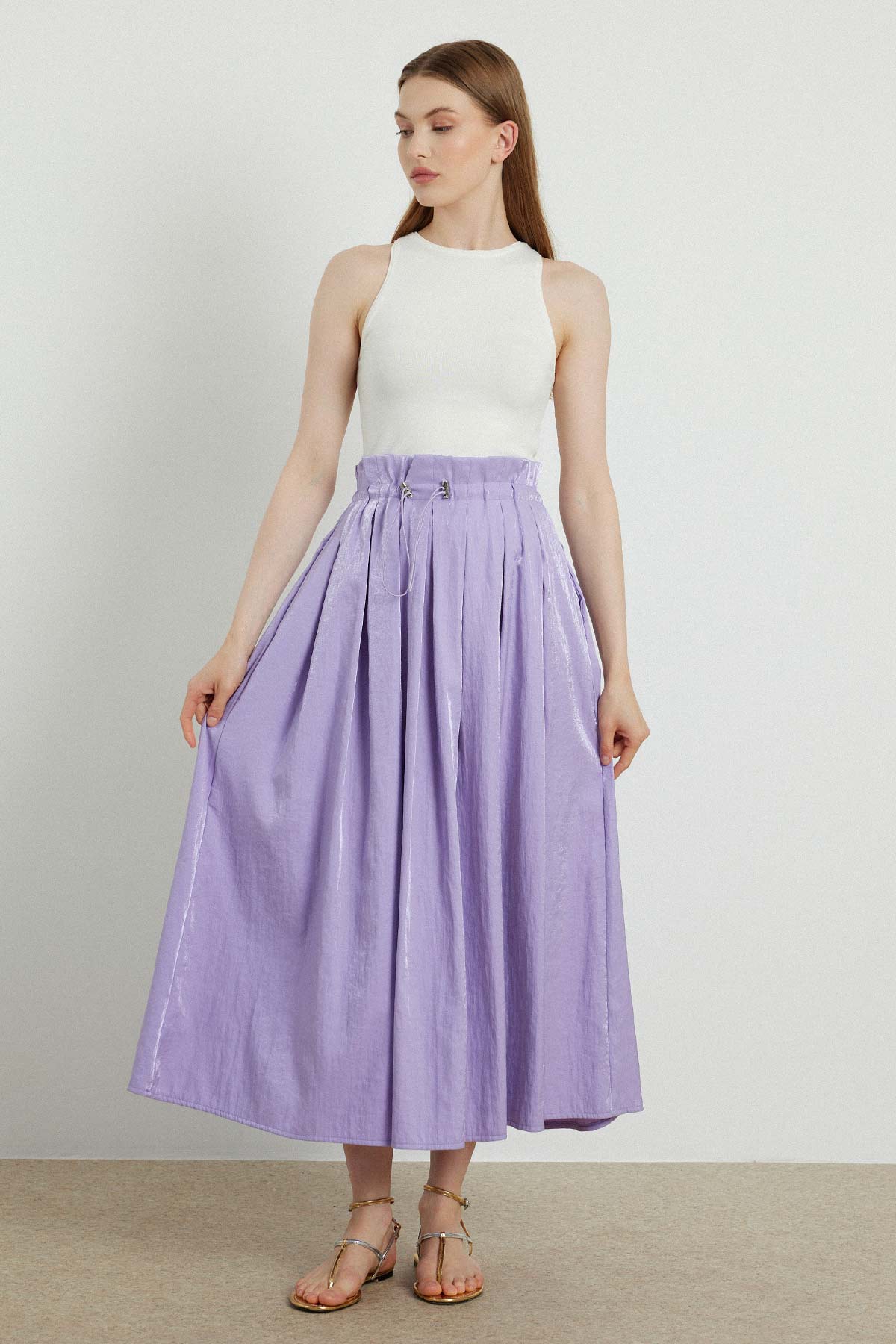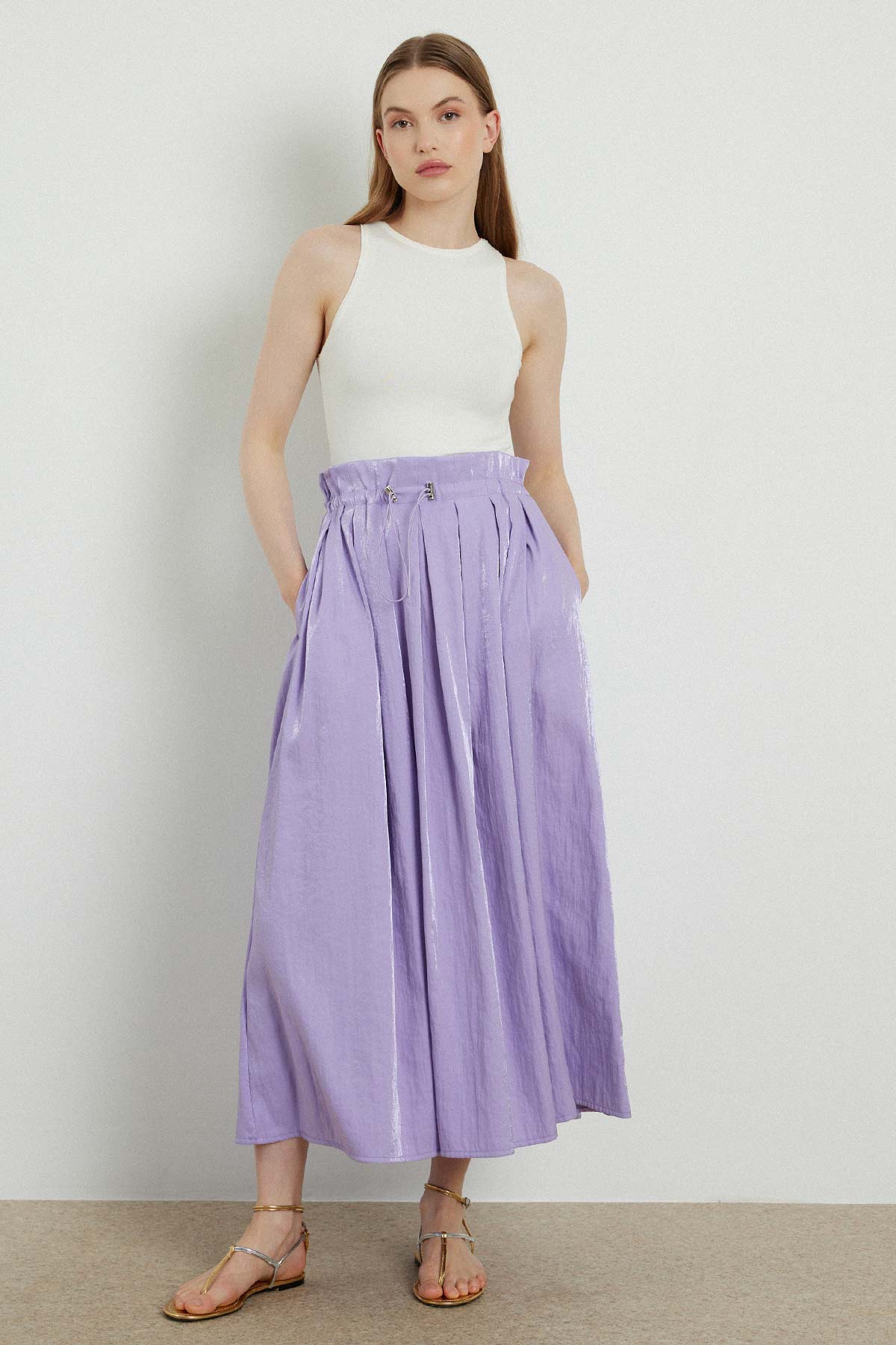 مميزات التنورة ذات الخصر المحدود القابل للتعديل: خط الخصر مطوي وسدادة قابلة للتعديل، جيوب جانبية، تنورة قماشية لامعة غير مبطنة. 70% بيس 30% سرير