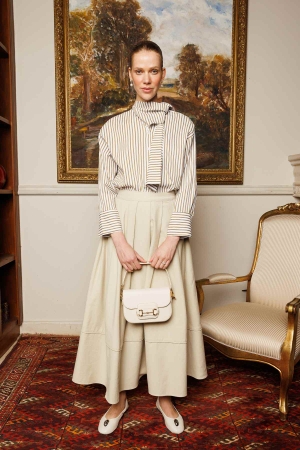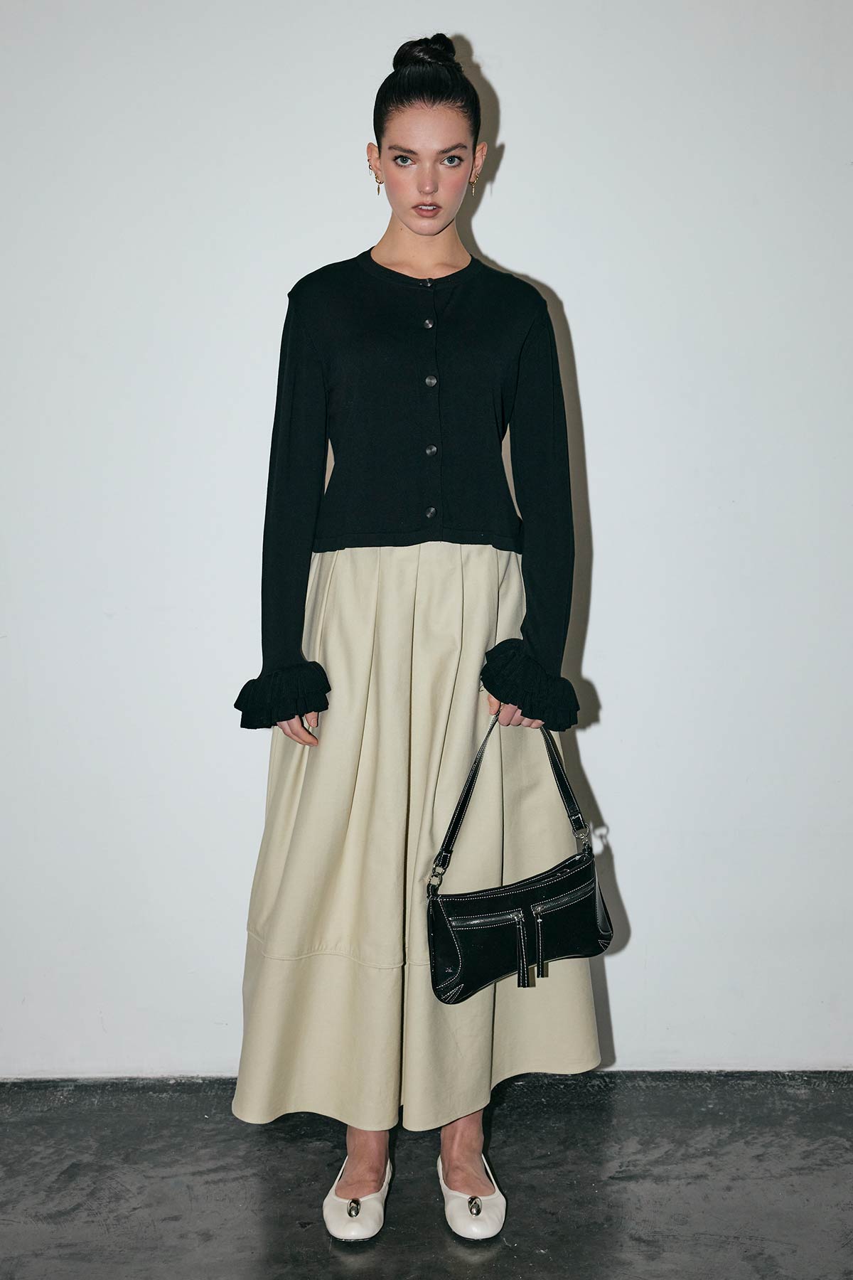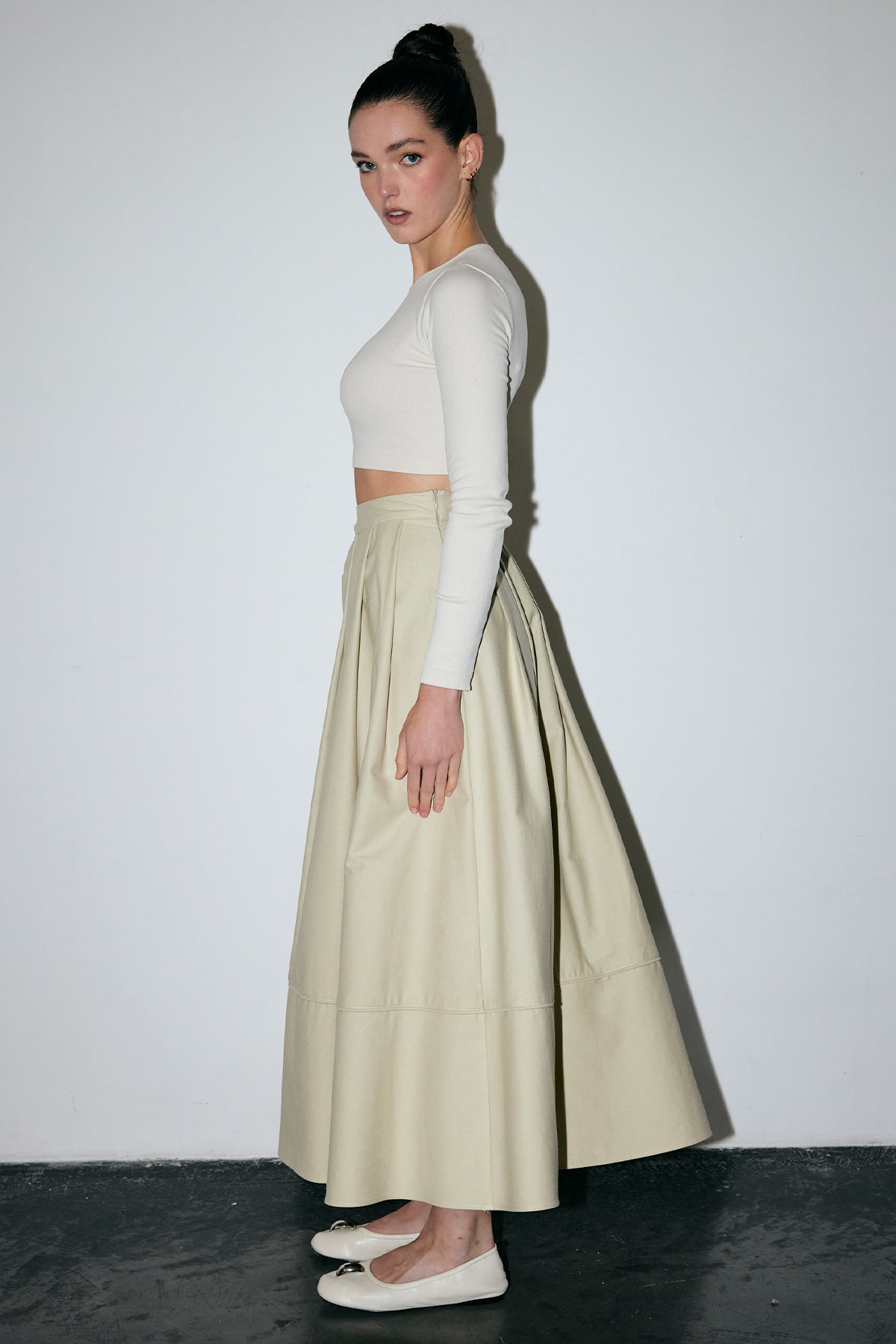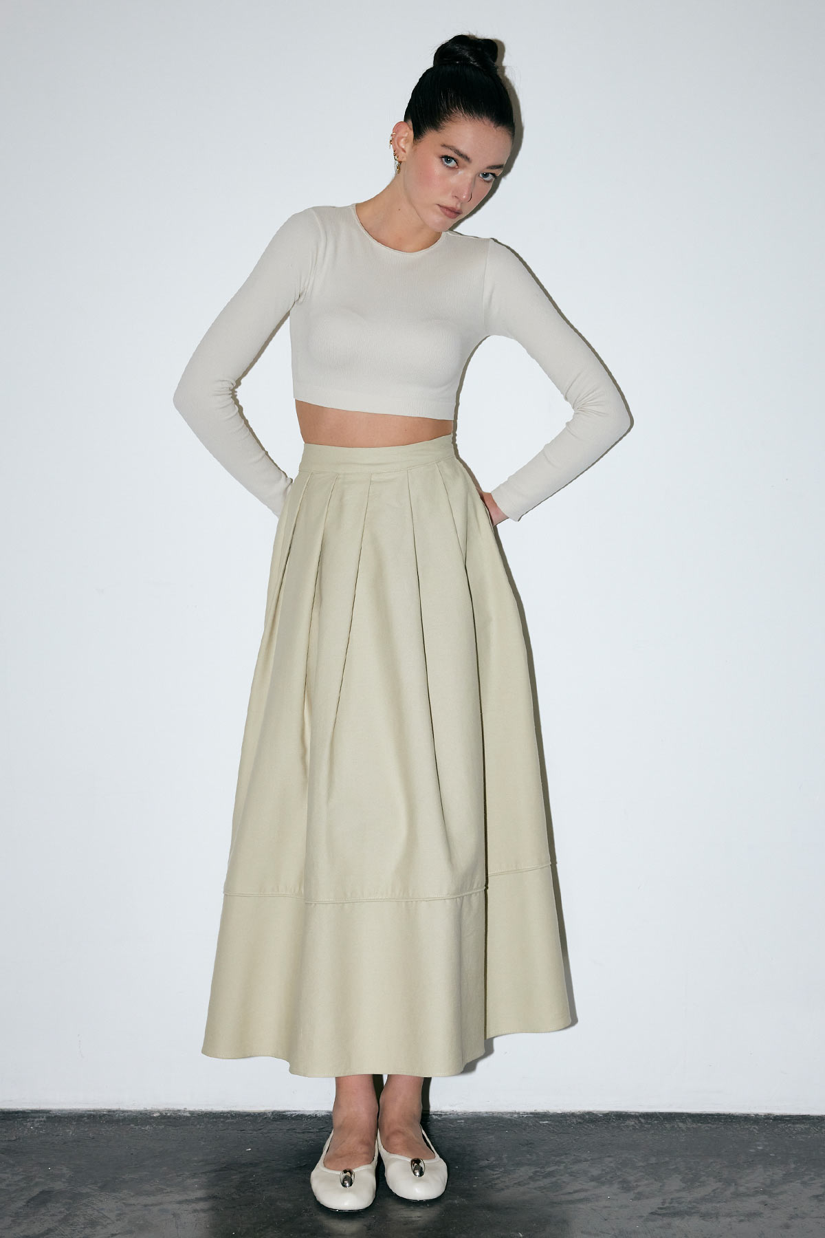 مميزات التنورة المطوية: تنورة واسعة مع تفاصيل مطوية، سحاب مخفي وفاصل. الغبرديني