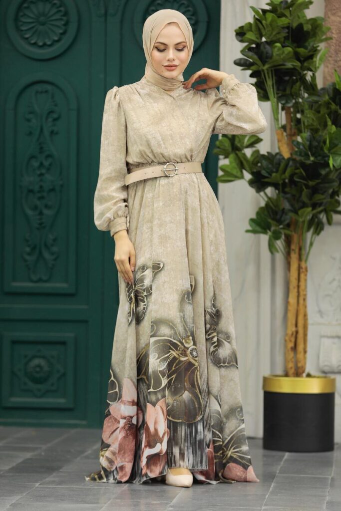 فستان سهرة حجاب – فستان سهرة حجاب بيج منقوش 39211beige