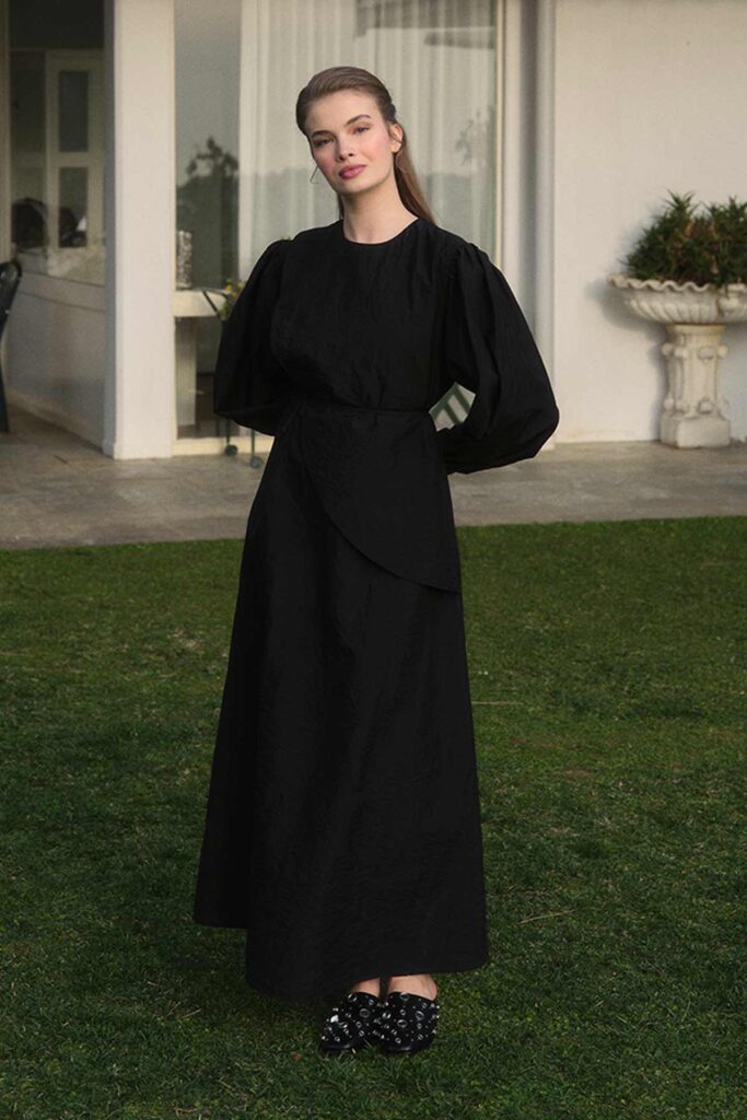 فستان أسود مع تفاصيل كيب غير متناظرة