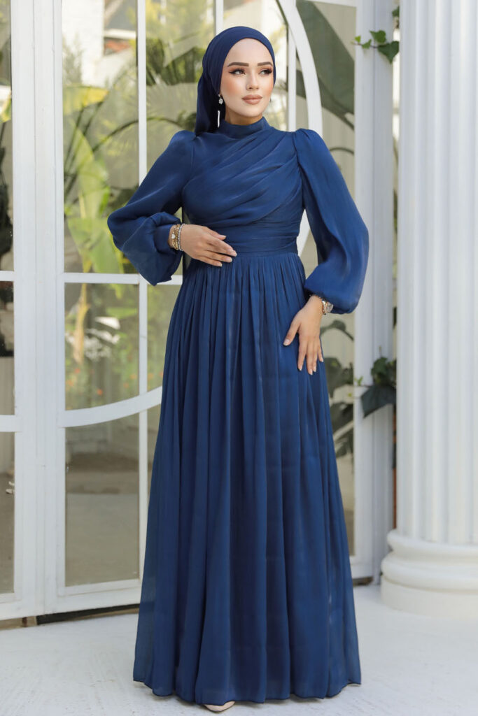 فستان سهرة للحجاب – فستان سهرة للحجاب باللون الأزرق الداكن مع تفاصيل ثنيات 44081l