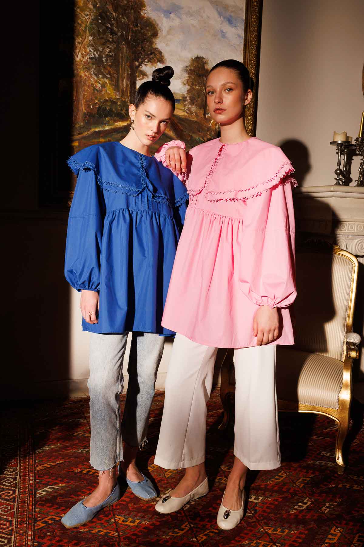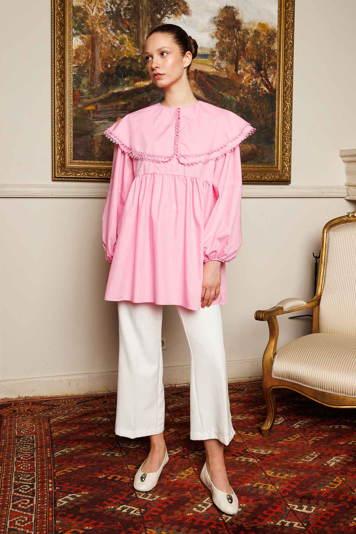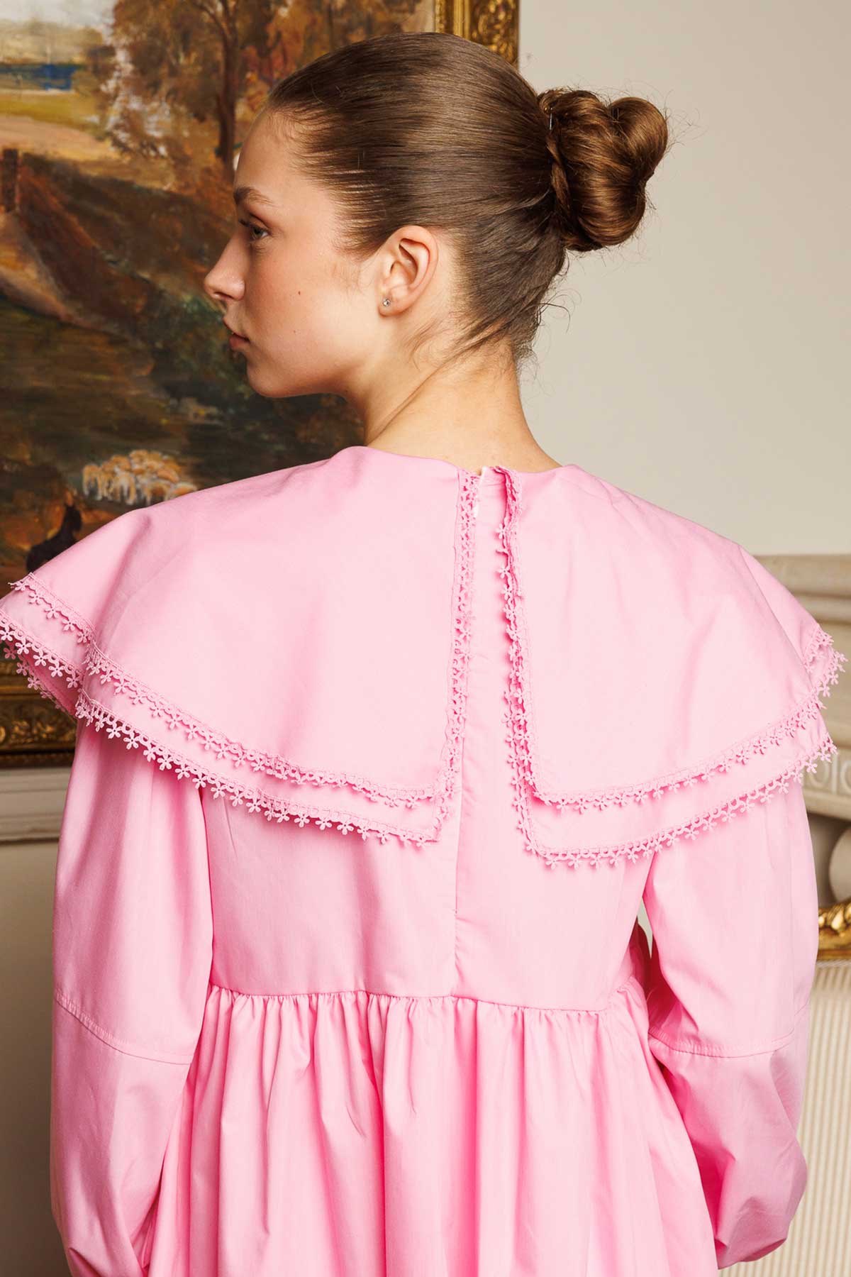 يتميز تونيك البوبلين ذو الياقة بقميص بوبلين ذو قصة مريحة مع ياقة الأميرة وشرائط على الحواف مطرزة بالدانتيل وأكمام بالون وخط خصر مضلع وتجمعات. 80% بيس 20% سرير