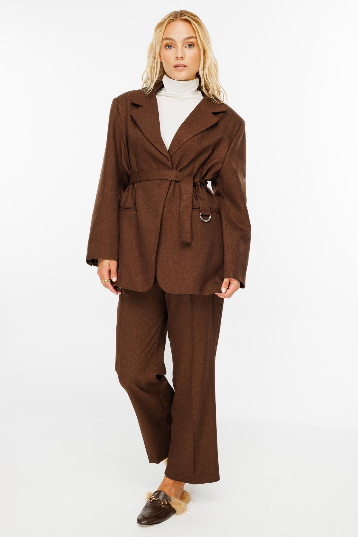 مميزات جاكيت بليزر بحزام ممتاز: نسيج منسوج فاخر، زر إغلاق أمامي مخفي، ياقة سترة، جيب أمامي مزخرف، إكسسوار بإبزيم على شكل حرف D من القماش الذاتي، بطانة مريحة 64% بيس 32% فيسكوز 4% إيلاستين.