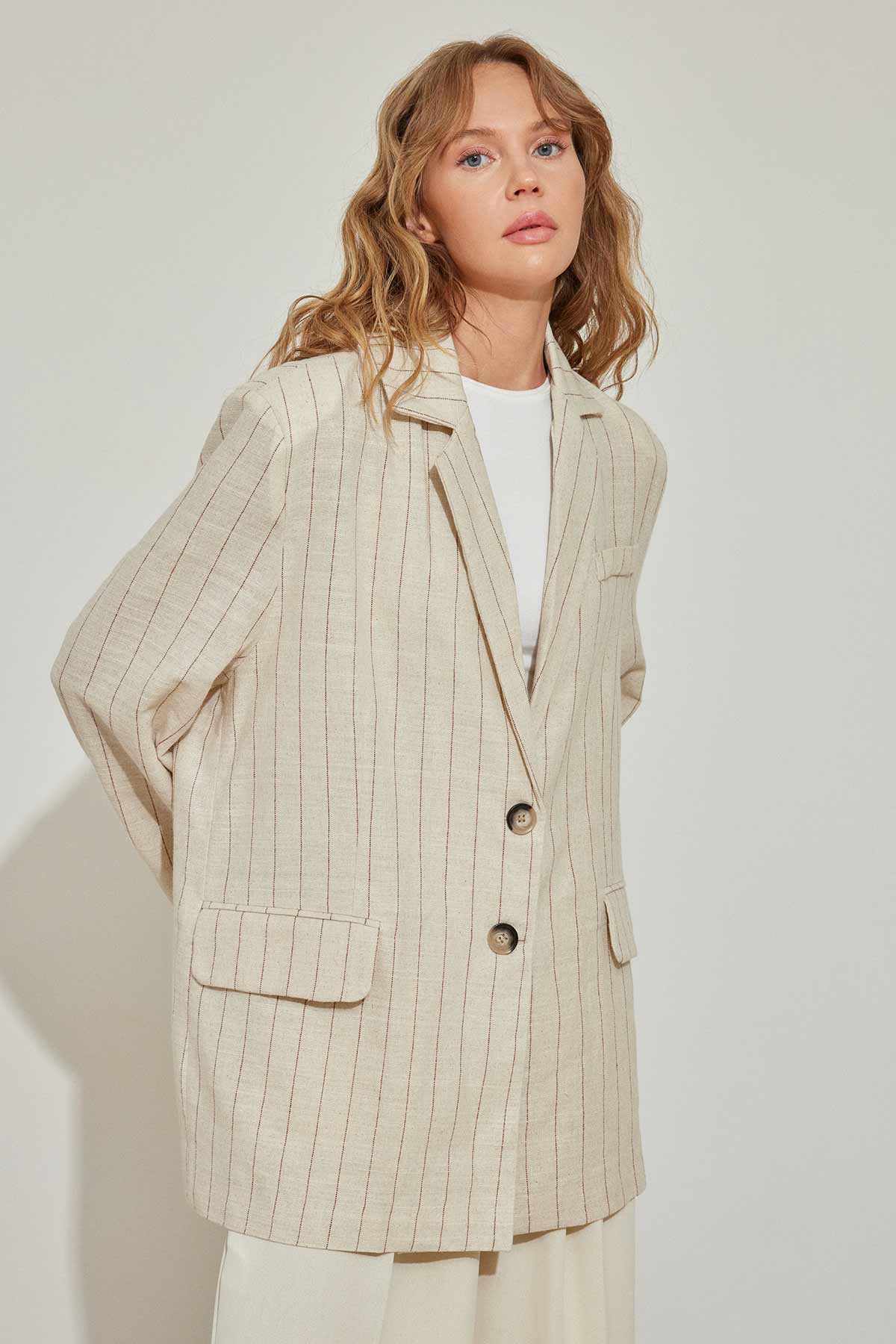 ميزات سترة Visolin المخططة: سترة من الكتان بأزرار أمامية، مبطنة وغير مبطنة، مريحة. 100% كتان يُغسل يدويًا مقلوبًا بالماء البارد. لا تستخدم المنقي. ضعه حتى يجف.
