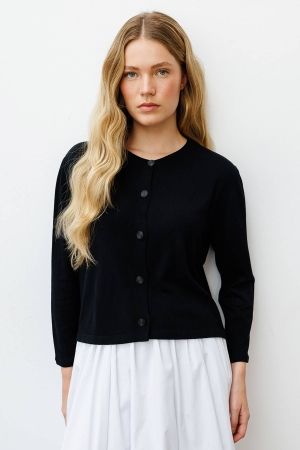 ميزات سترة Perla المحبوكة: رقبة دائرية، أزرار أمامية، سترة محبوكة ناعمة الملمس. 95% فيسكوز، 5% نايلون. ضعه ليجف أو نظفه بالتنظيف الجاف.