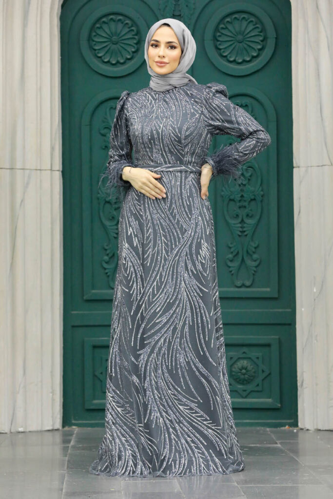 فستان سهرة حجاب – فستان سهرة حجاب فضي مدخن 23061fu