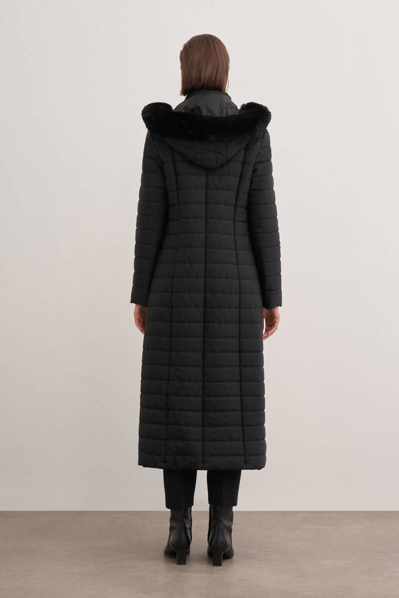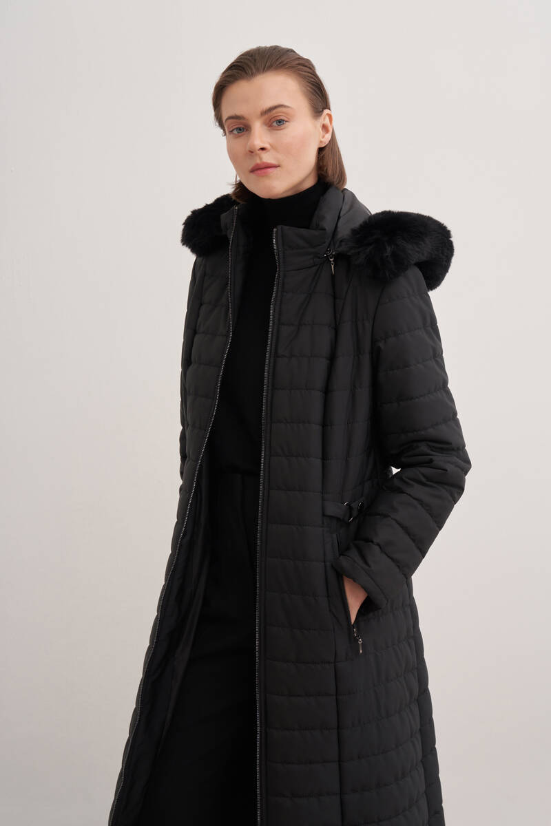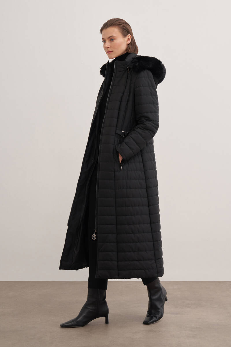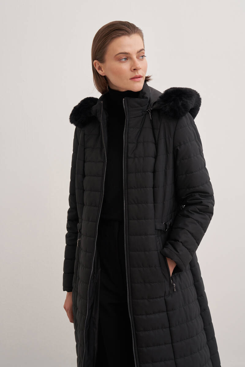 سترة سوداء طويلة 5400111 مع تفاصيل من الفرو
