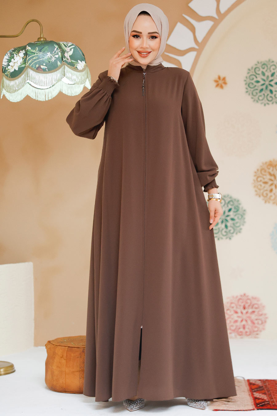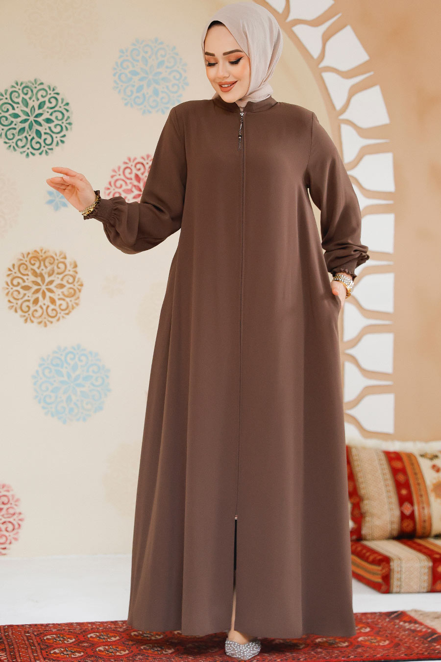 مميزات القماش: 95% بيس. مصنوع من نسيج ليكرا بنسبة 5%. مميزات المنتج: ياقة واقفة، وأكمام طويلة، وأطراف أكمام مطاطية، وجيوب على الجانبين، وسحاب في المنتصف. طول المنتج: 140 سم. لون المنتج: بني – قد يكون هناك اختلاف في لون المنتج بسبب أسلوب الحياة. محتوى الطلب: هذا المنتج ليس مزيجًا. تتكون من عباية فقط مقاس العينة: 38 الغسيل: يمكن غسله على درجة حرارة 30 دون عصر قياسات الموديل الارتفاع: 165 سم الخصر: 67 سم الأرداف: 98 سم الصدر: 85 سم الوزن: 57.