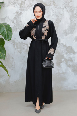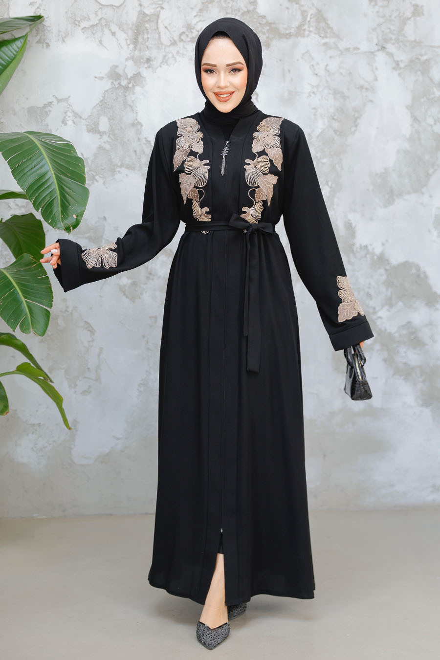 عباية حجاب مطرزة باللون الأسود والبيج 29124sbeige