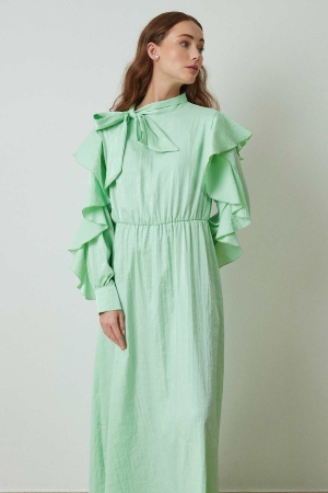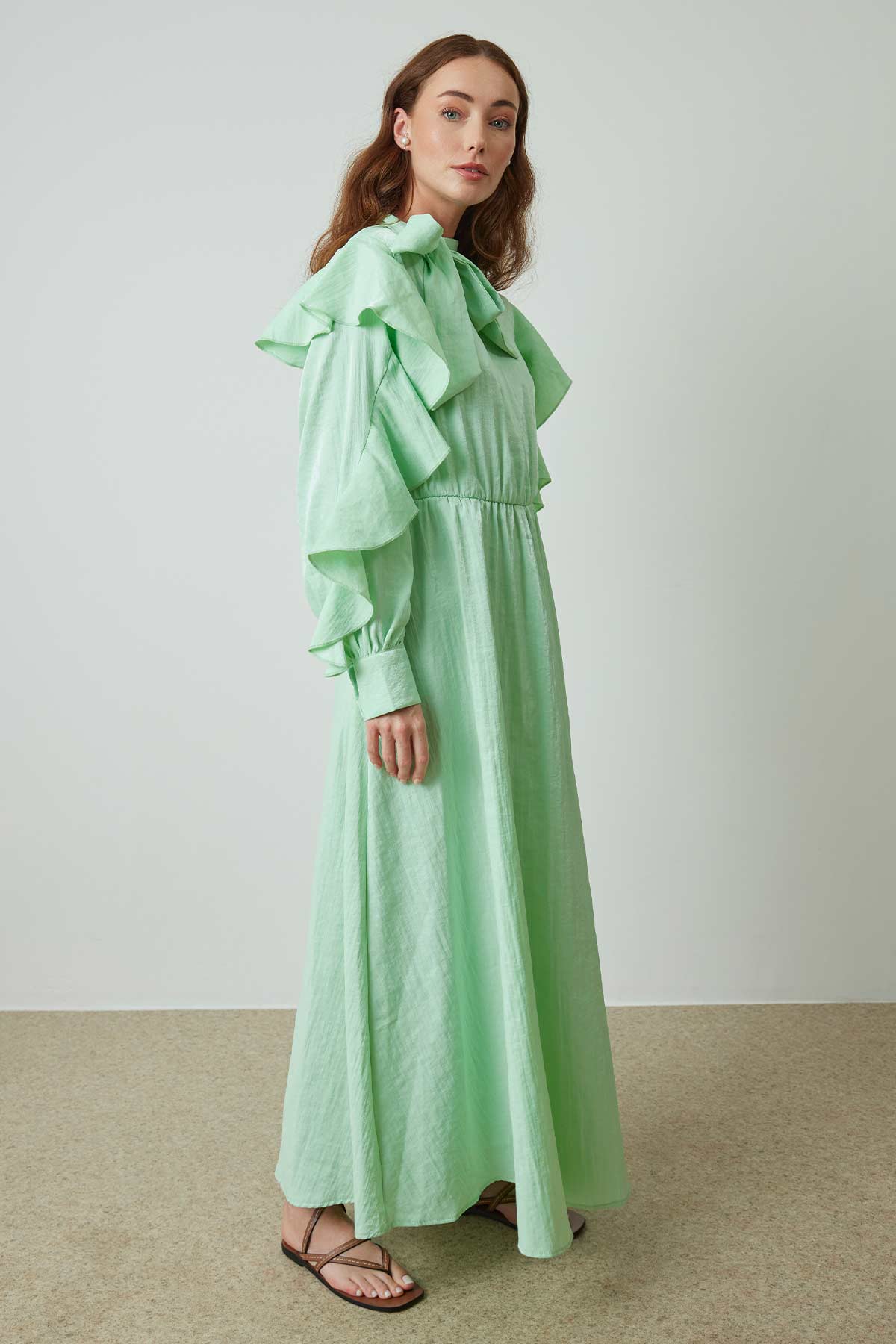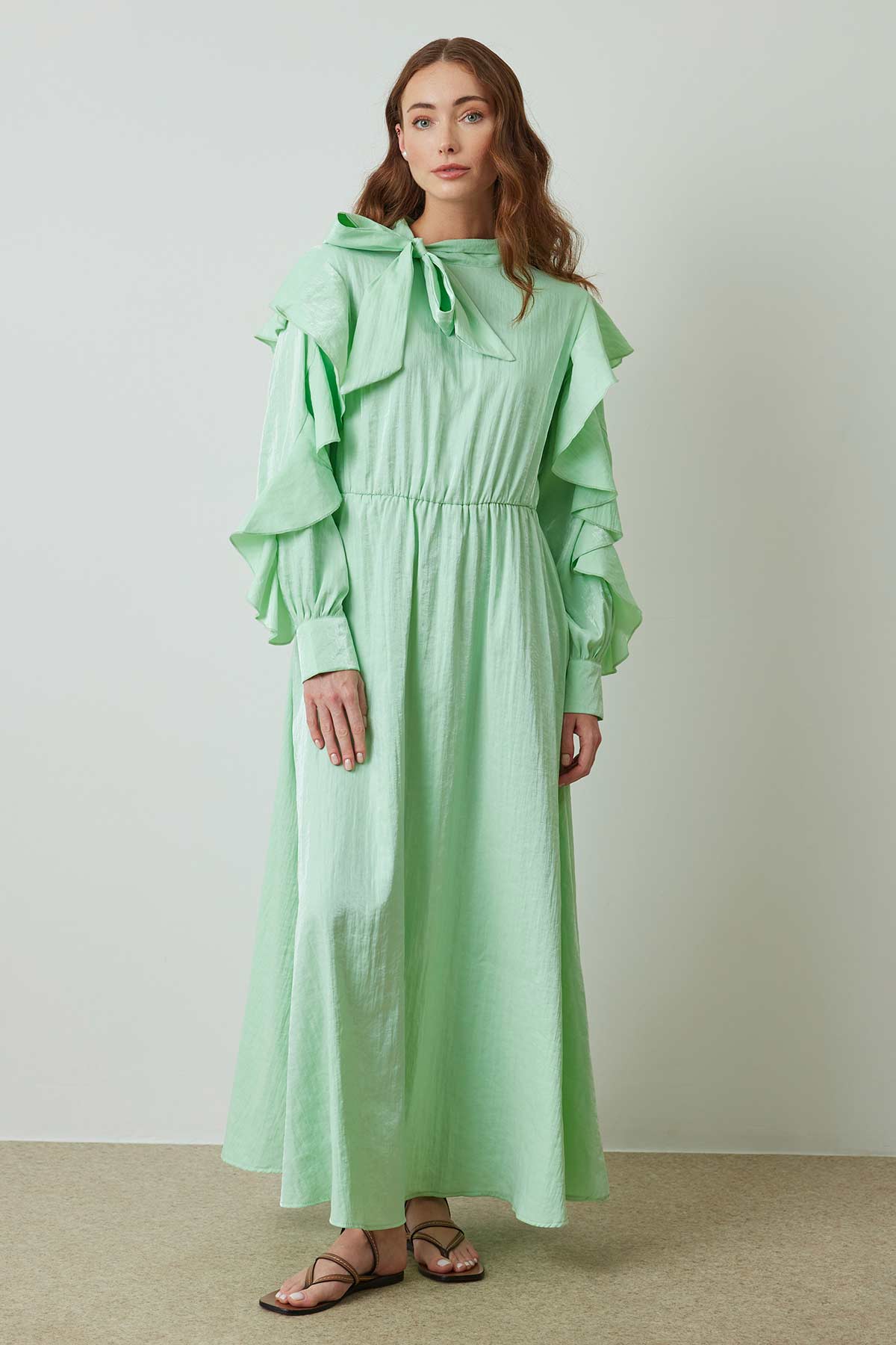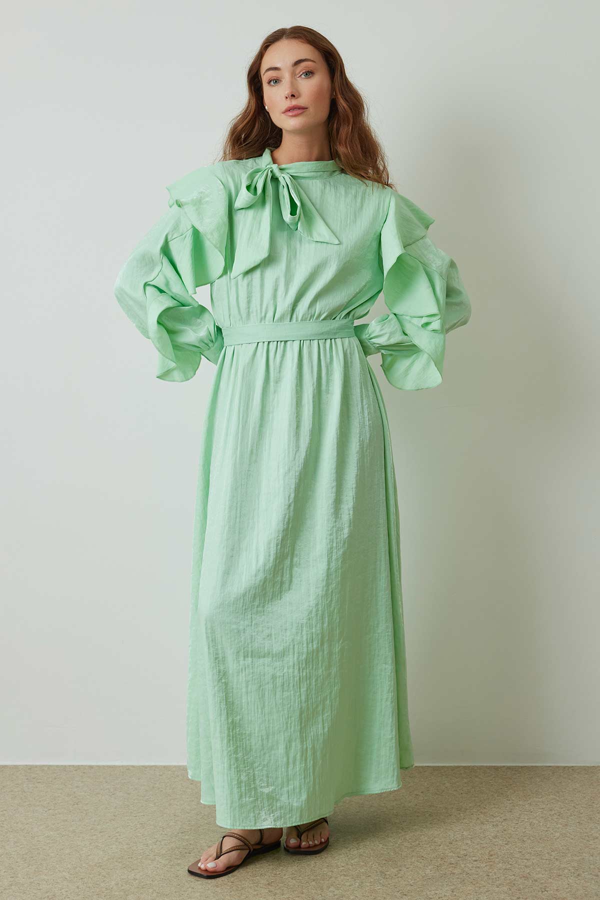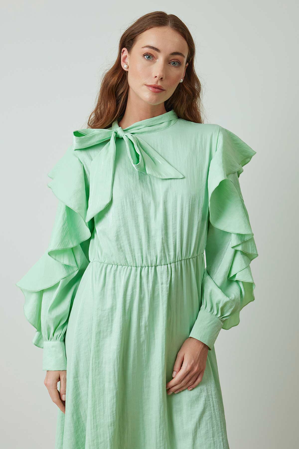مميزات الفستان اللامع بأكمام كشكش: فستان أنيق بياقة وشاح، وأكمام مقصوصة، وسحاب مخفي وزر إغلاق في الخلف، وخصر مطاطي، وحزام متحرك، غير مبطن، نسيج لامع 80% نايلون 20% تنظيف جاف فقط.