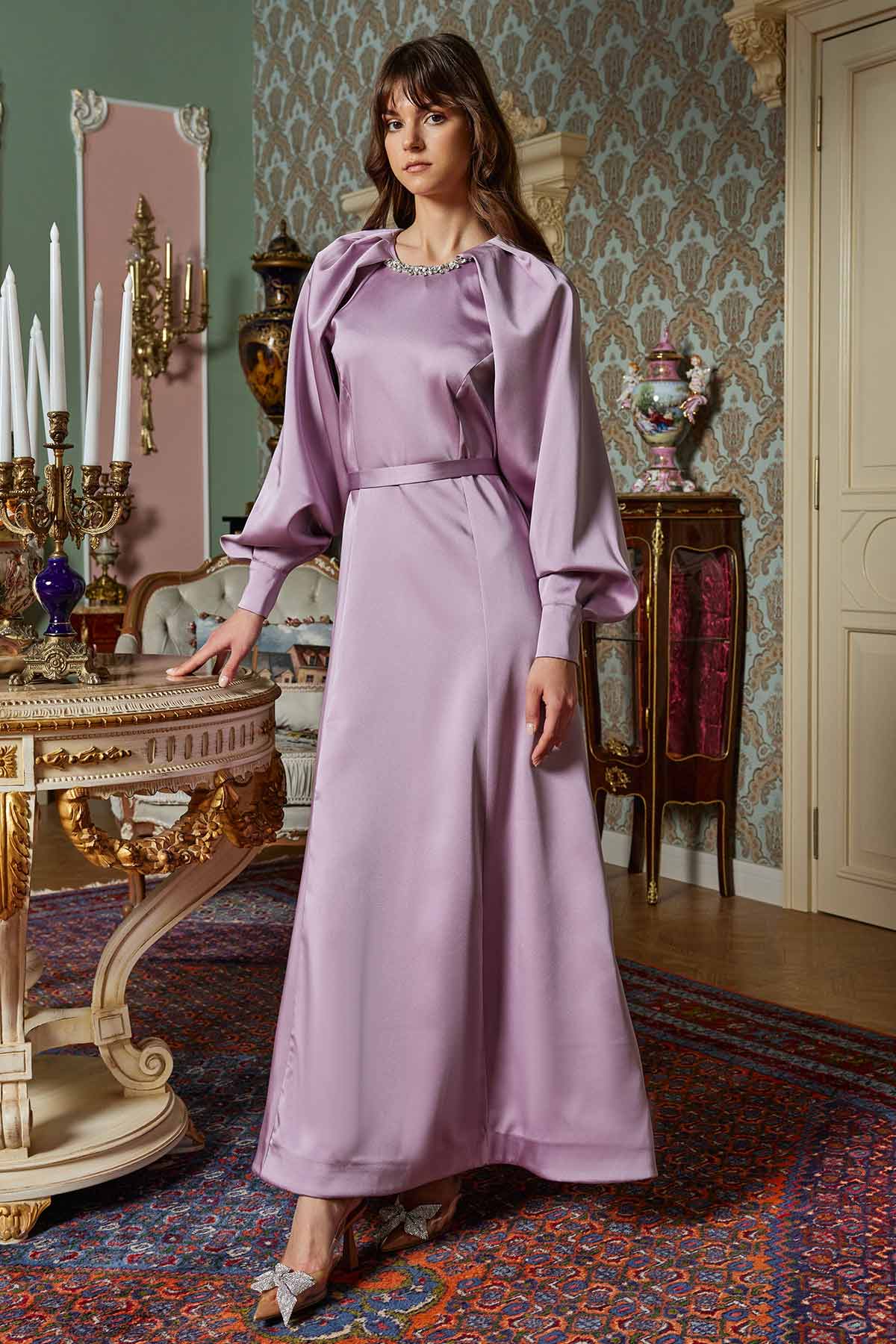فستان أرجواني فاتح مع تطريز حجري على الياقة